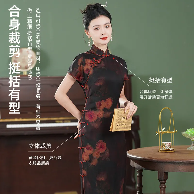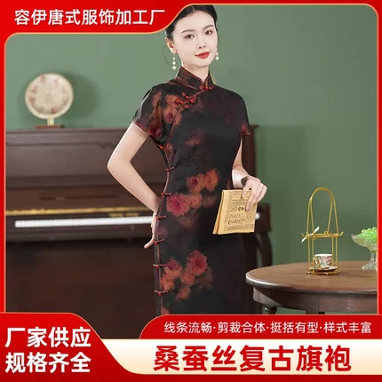 新款重磅香云纱真丝桑蚕丝复古旗袍斜襟真襟旗袍裙日常优雅旗袍