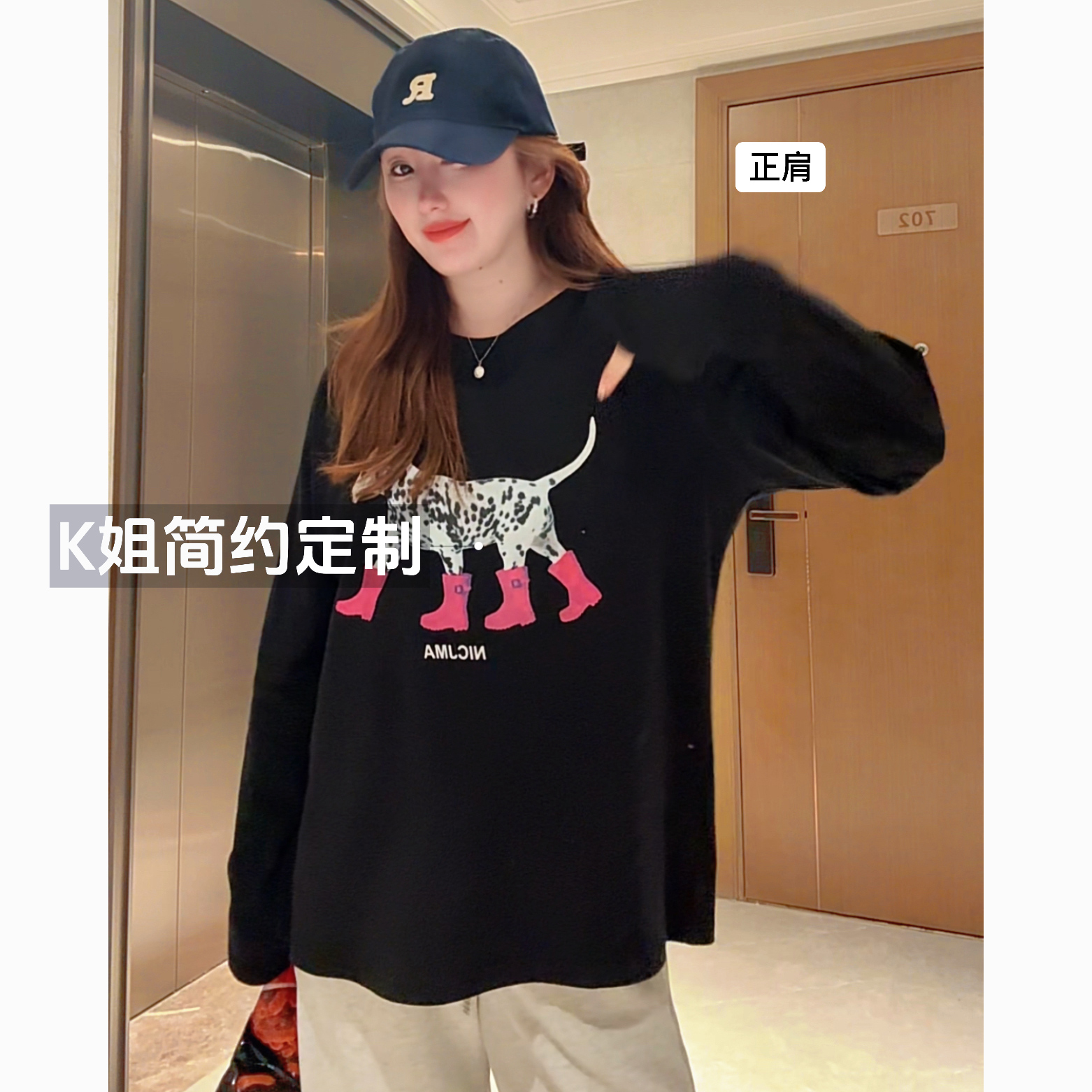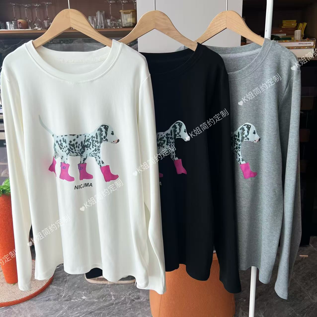 2025新款早秋百搭印花圆领长袖T恤女春秋宽松显瘦打底衫正肩上衣