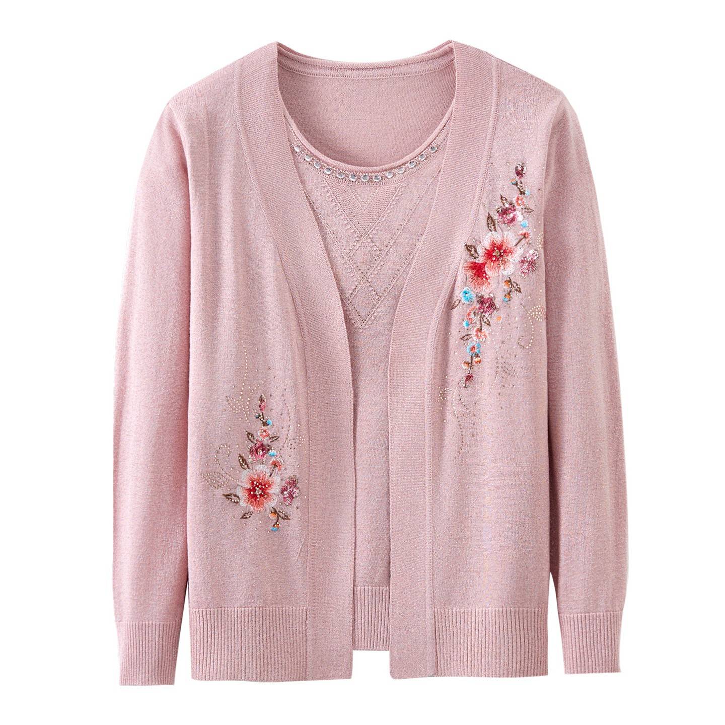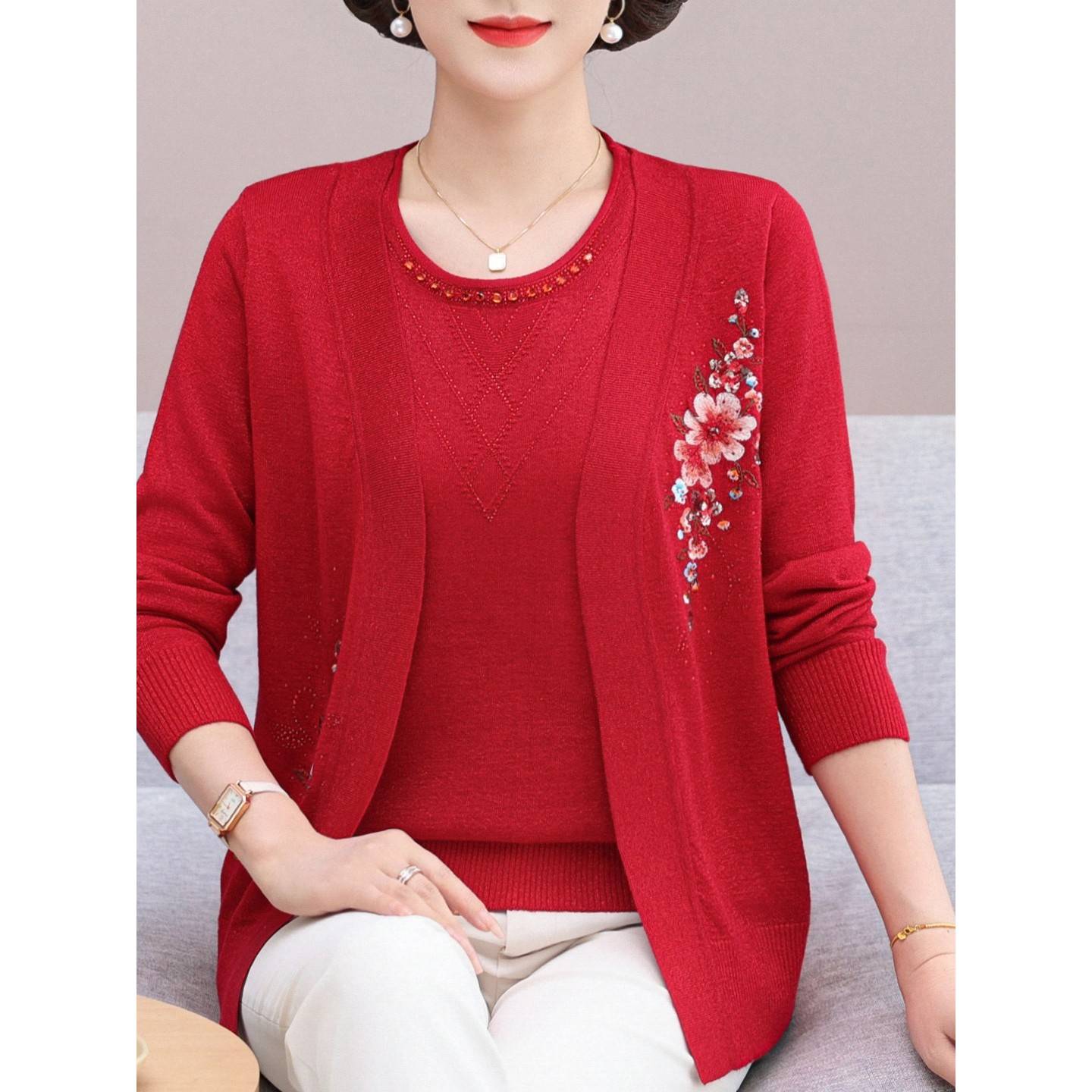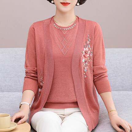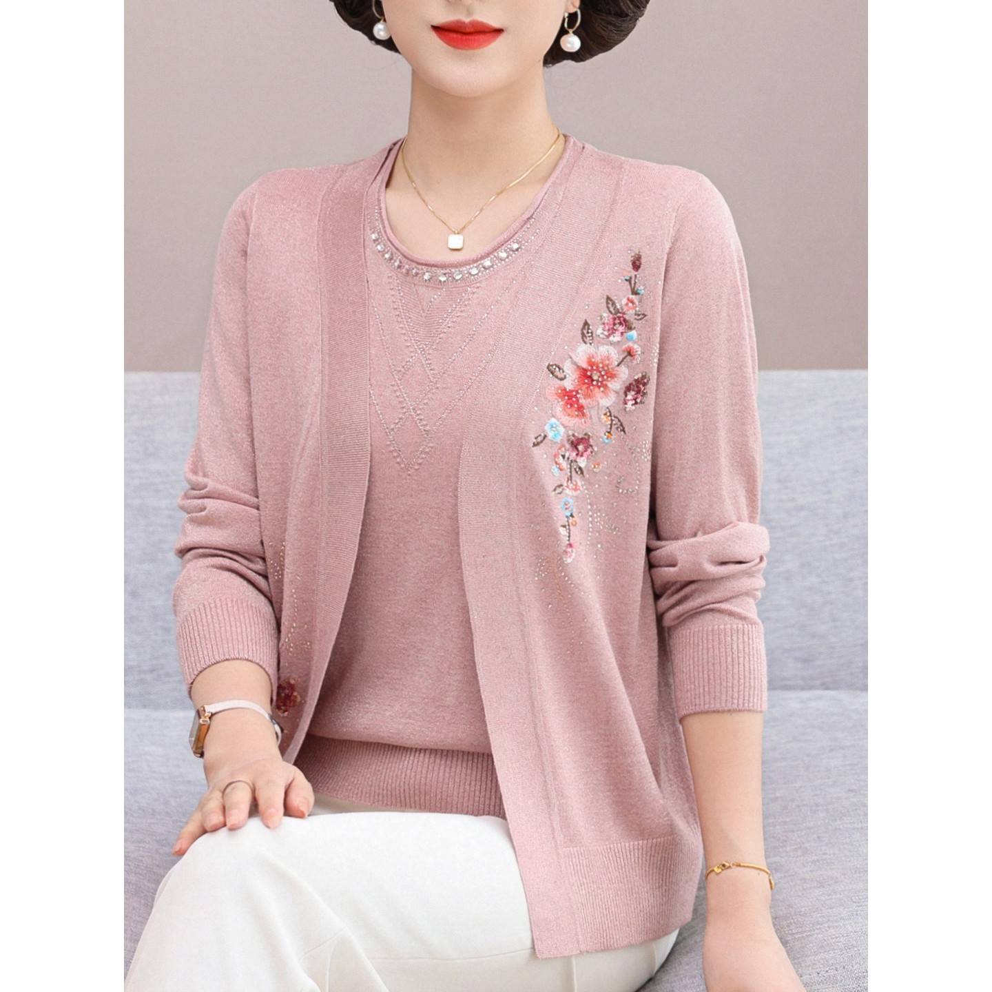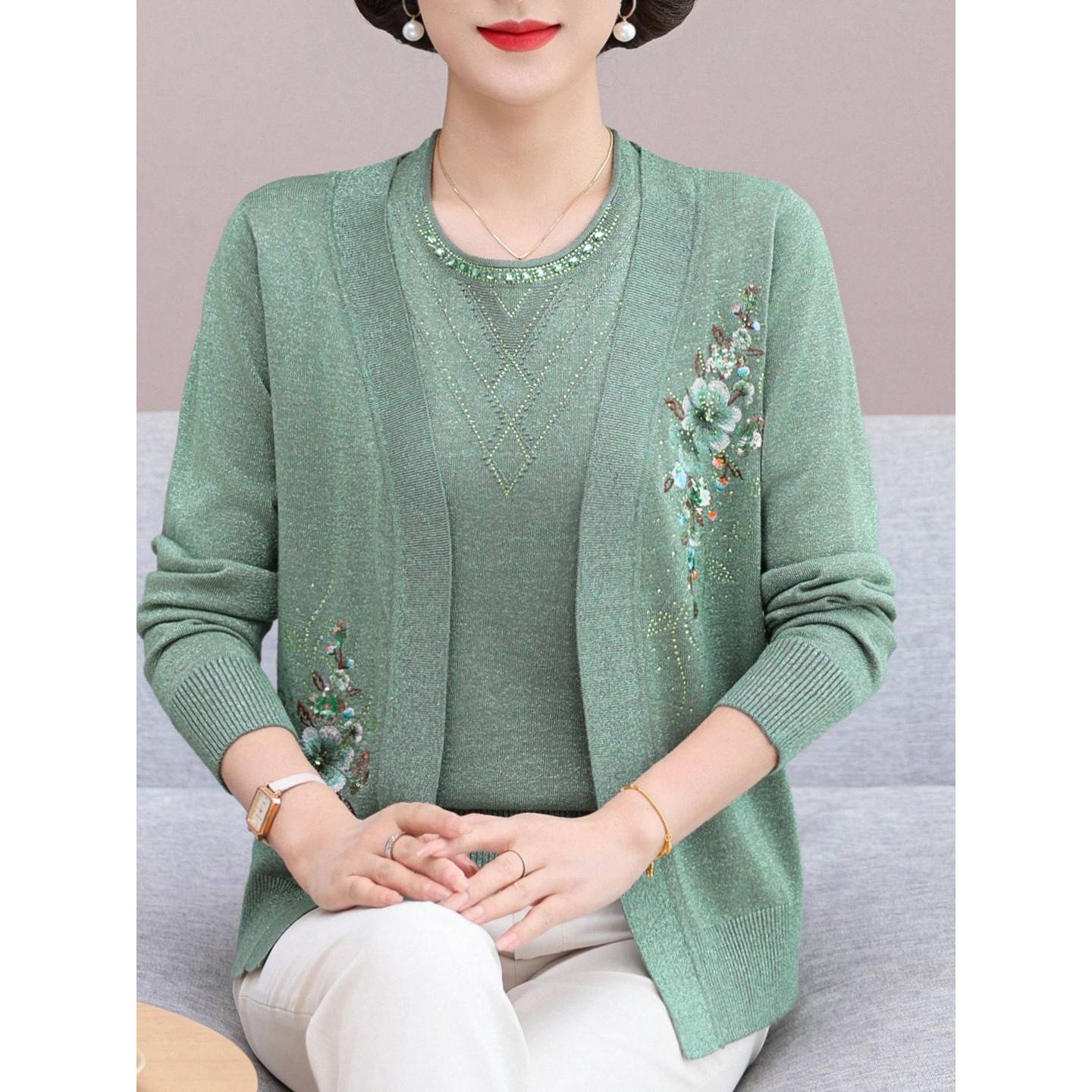 洋气妈妈桑蚕丝针织开衫女春秋两件套装加肥加大码中老年薄款外搭