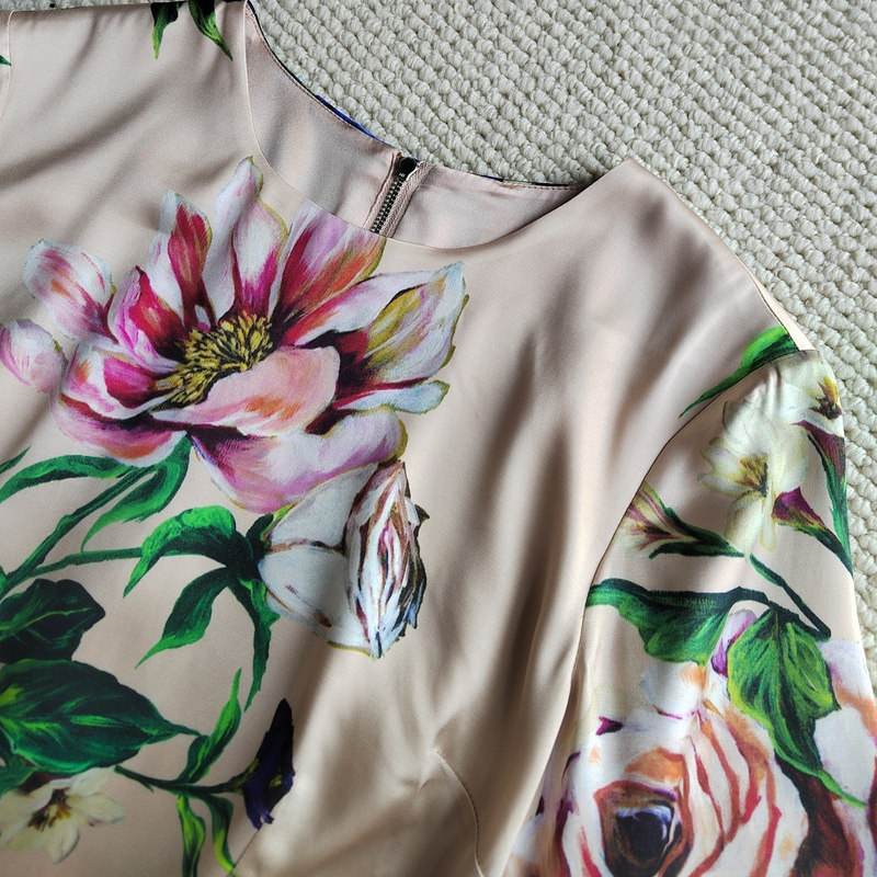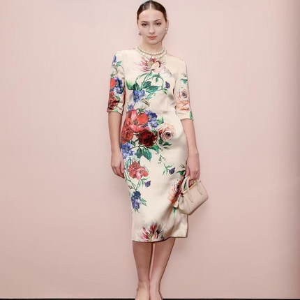 缎面真丝印花裸粉色旗袍连衣裙