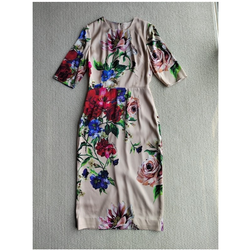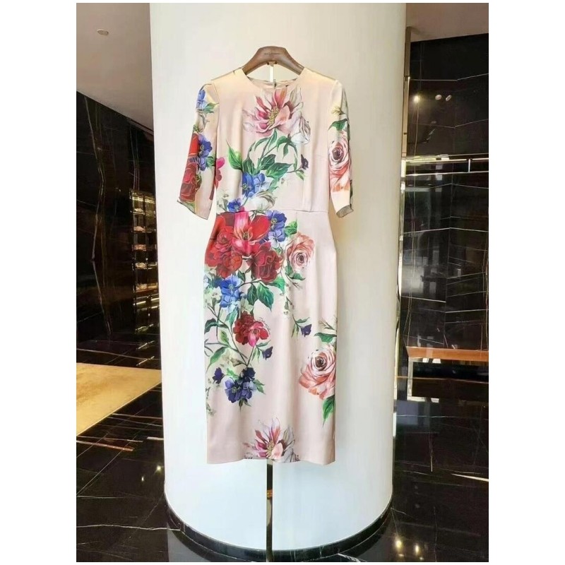 C3西西里高定25春夏优雅光泽缎面桑蚕丝定位印花裸粉色旗袍连衣裙