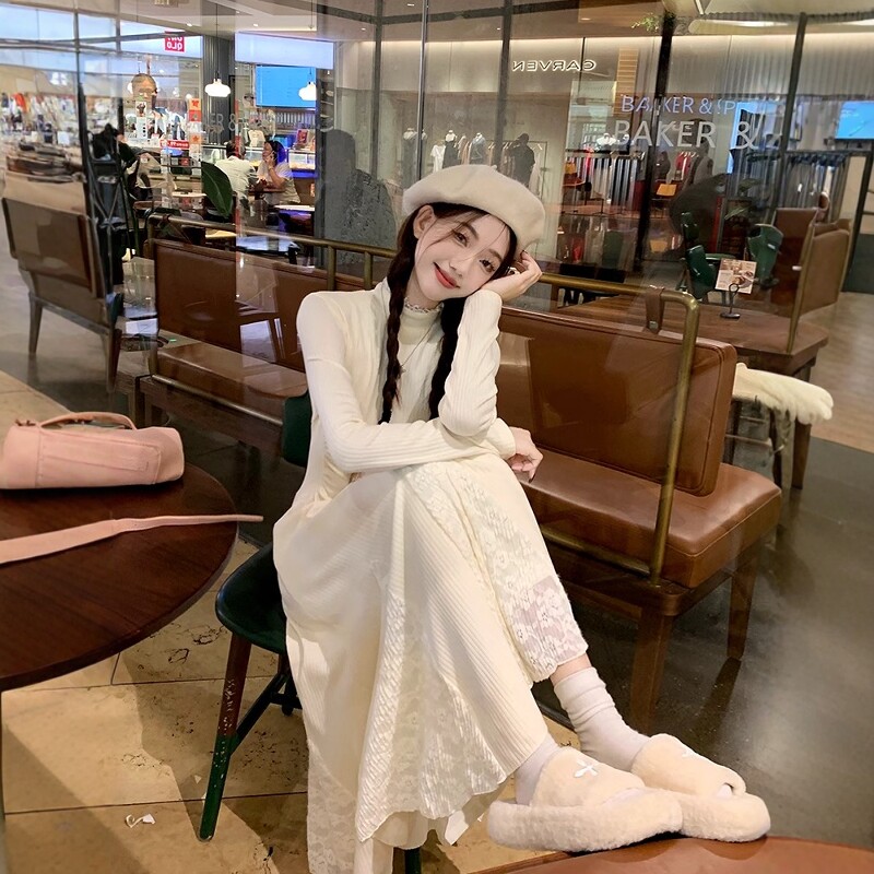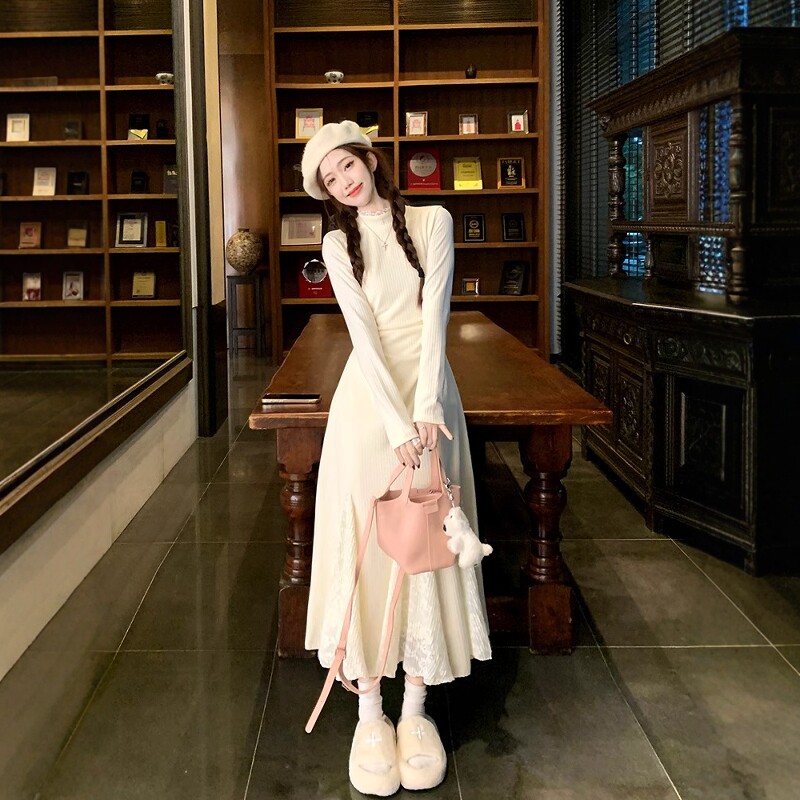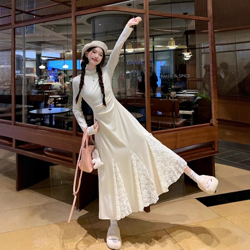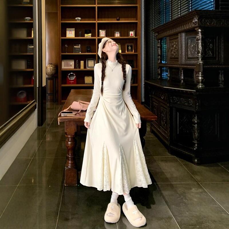 白色高领针织连衣裙女秋冬加绒配大衣内搭打底修身鱼尾毛衣长裙子