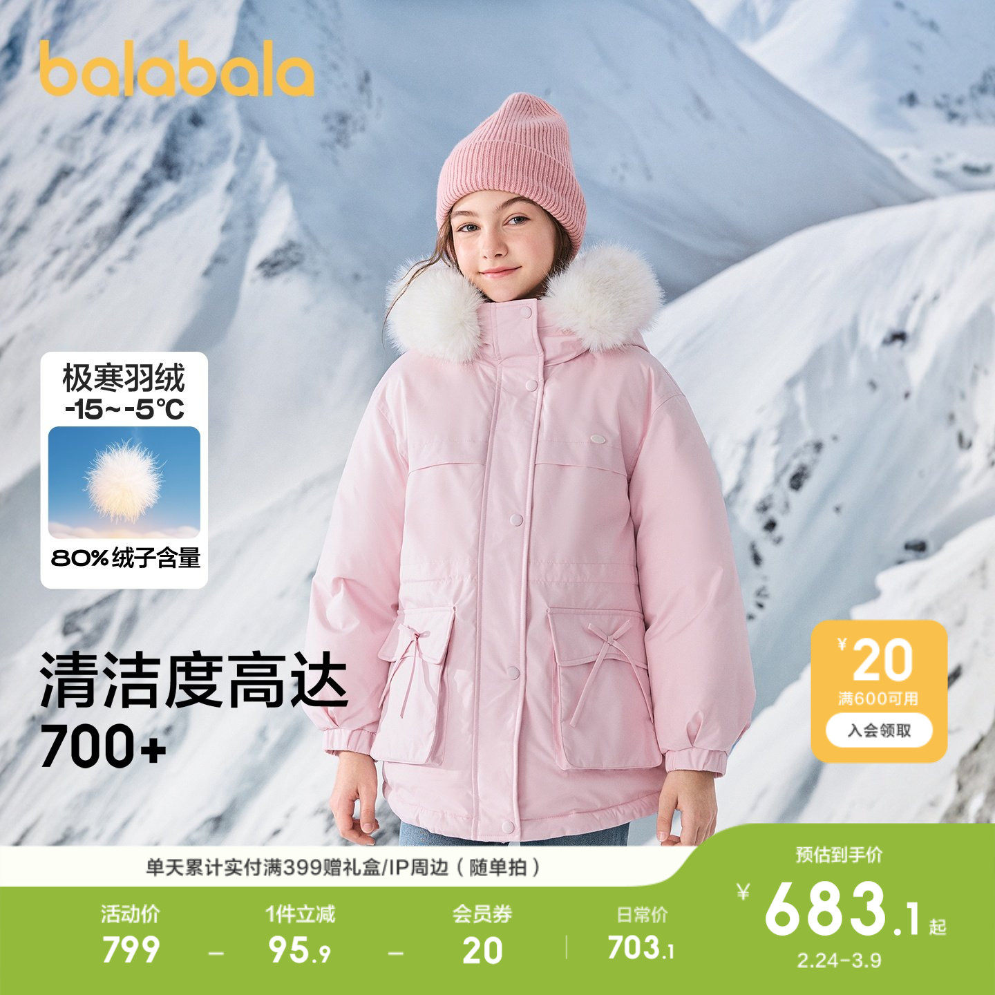 【商场同款】巴拉巴拉童装女童羽绒服衣服新款收腰保暖外套冬甜美