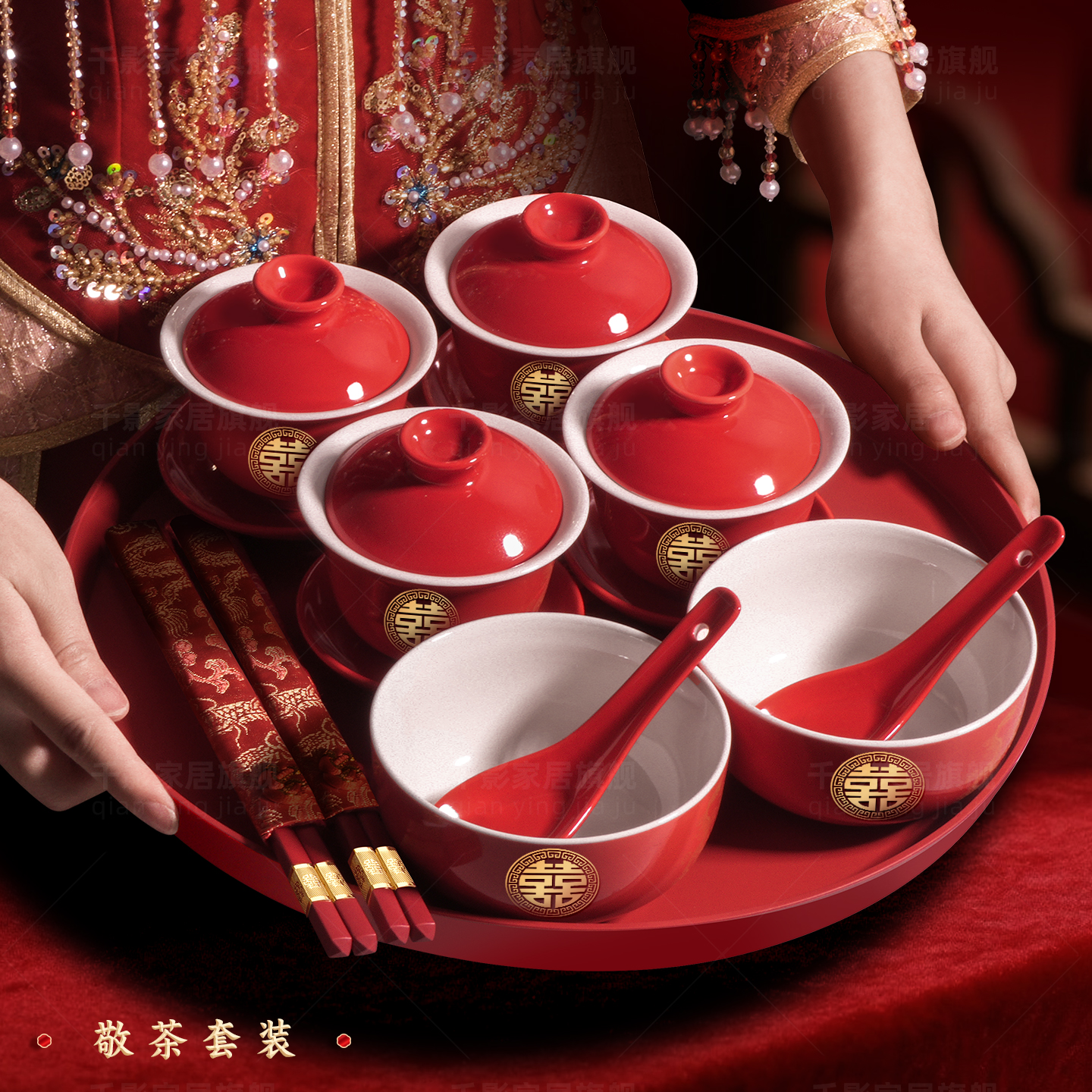 结婚敬茶杯套装红色喜碗改口杯子四一对茶具婚礼敬酒婚庆用品大全
