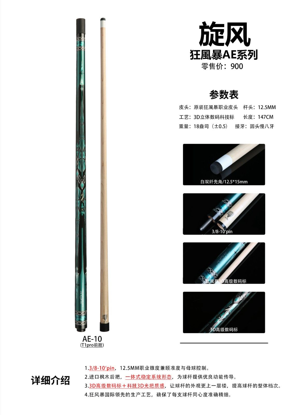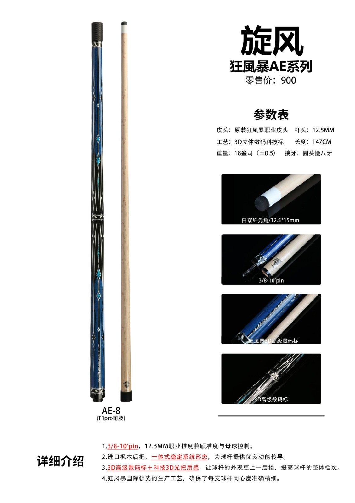 fury威利台球杆AE狂风暴大头杆中式黑八美式九球桌球杆硬枫12.5