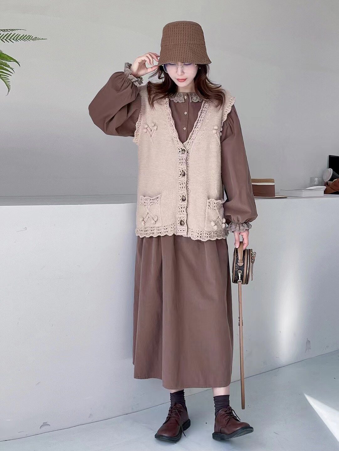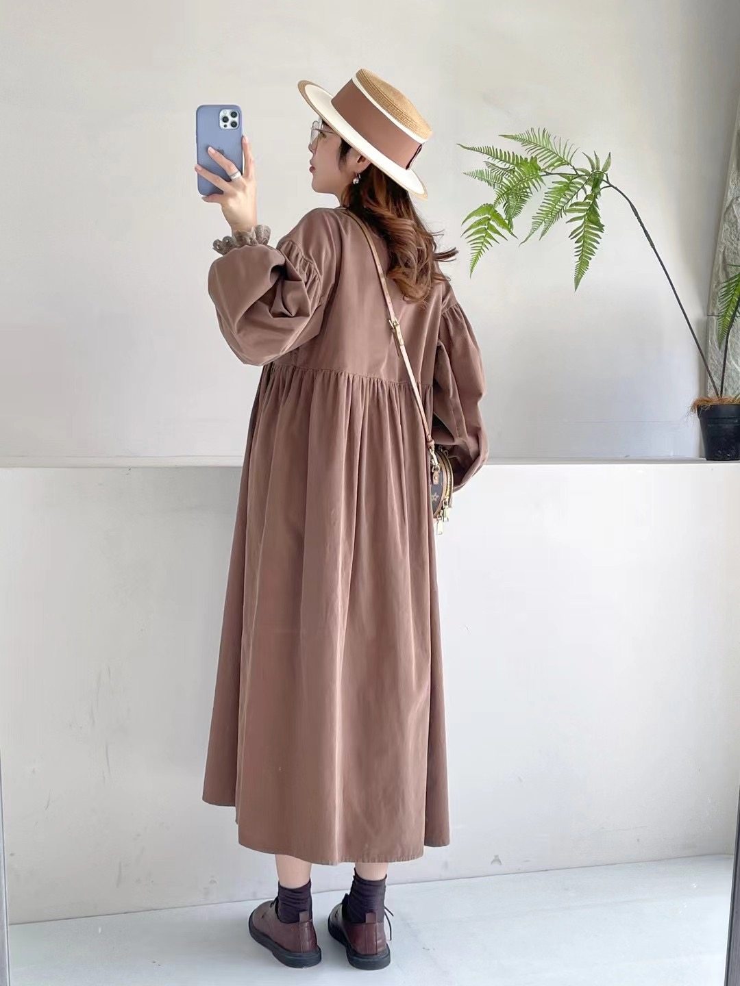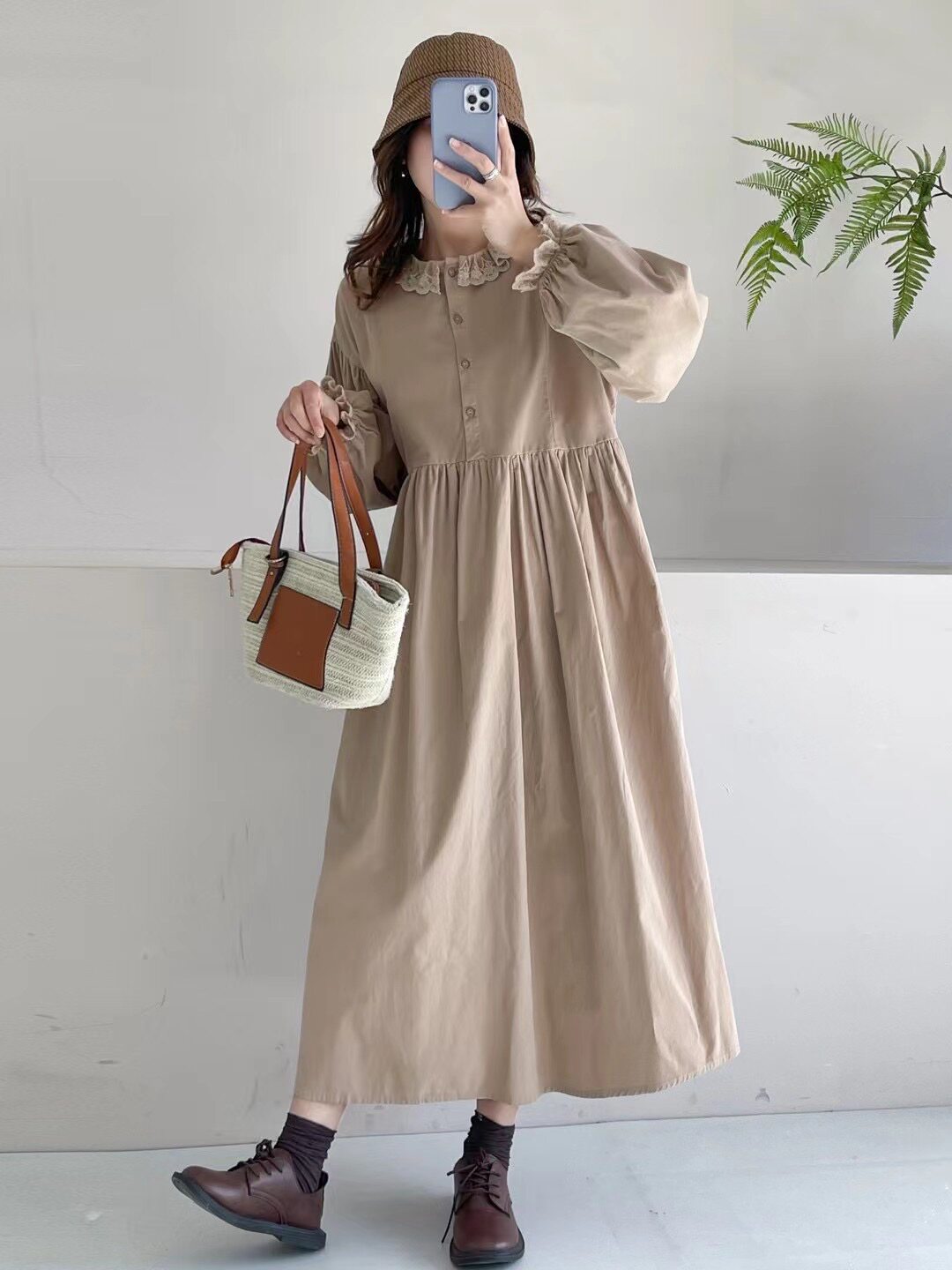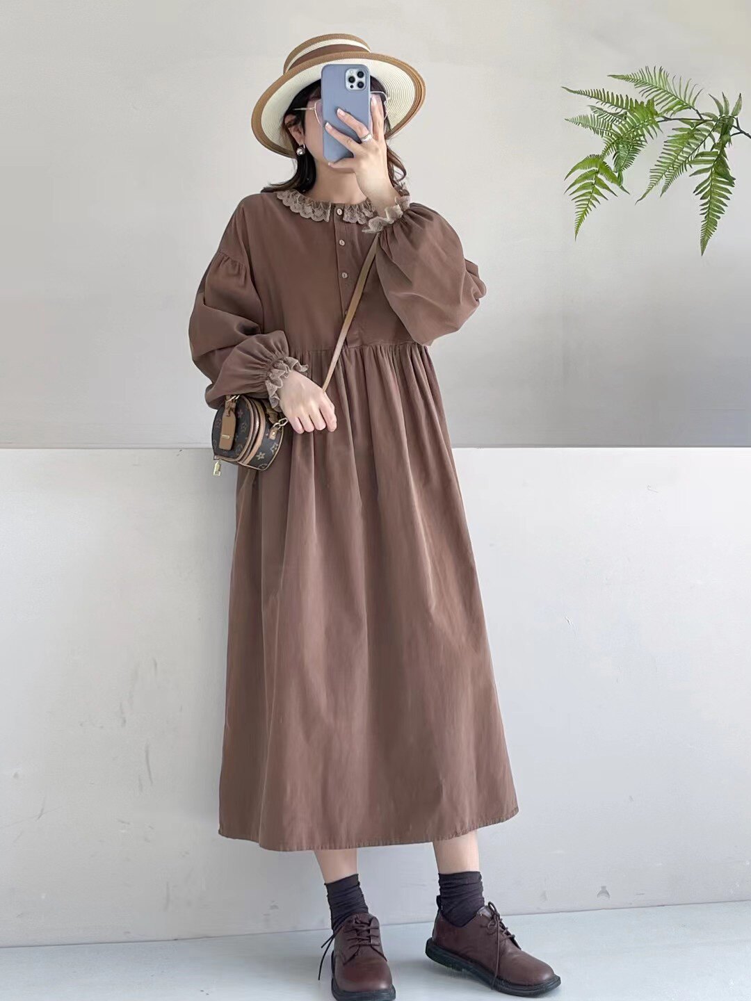 复古文艺森系宽松休闲长袖连衣裙蕾丝翻领细软灯芯绒过膝气质长裙