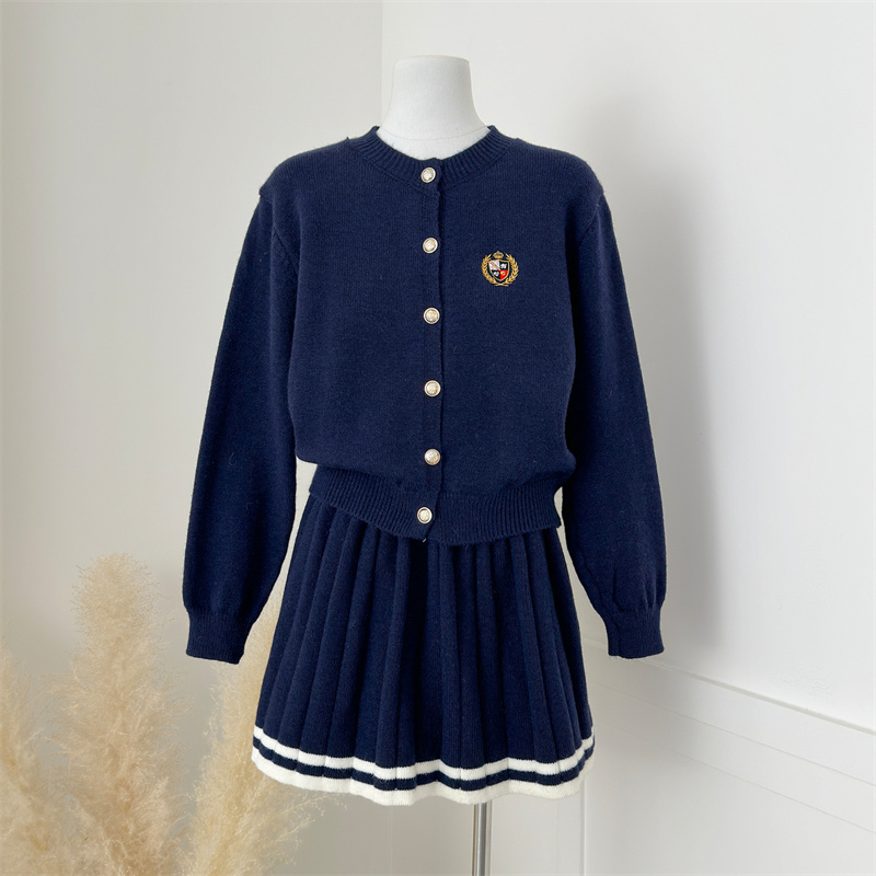 学院风温柔显瘦长袖针织开衫女春秋新款修身上衣百褶半身裙两件套