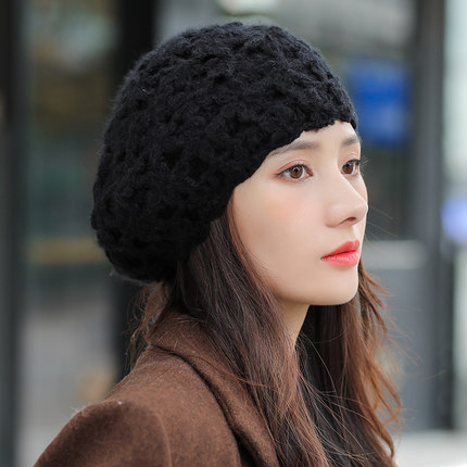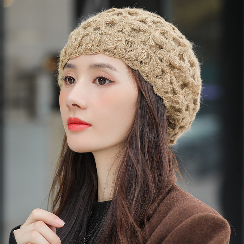 女士帽子秋冬毛线贝雷帽女镂空钩花针织百搭时尚潮流手工包头堆堆