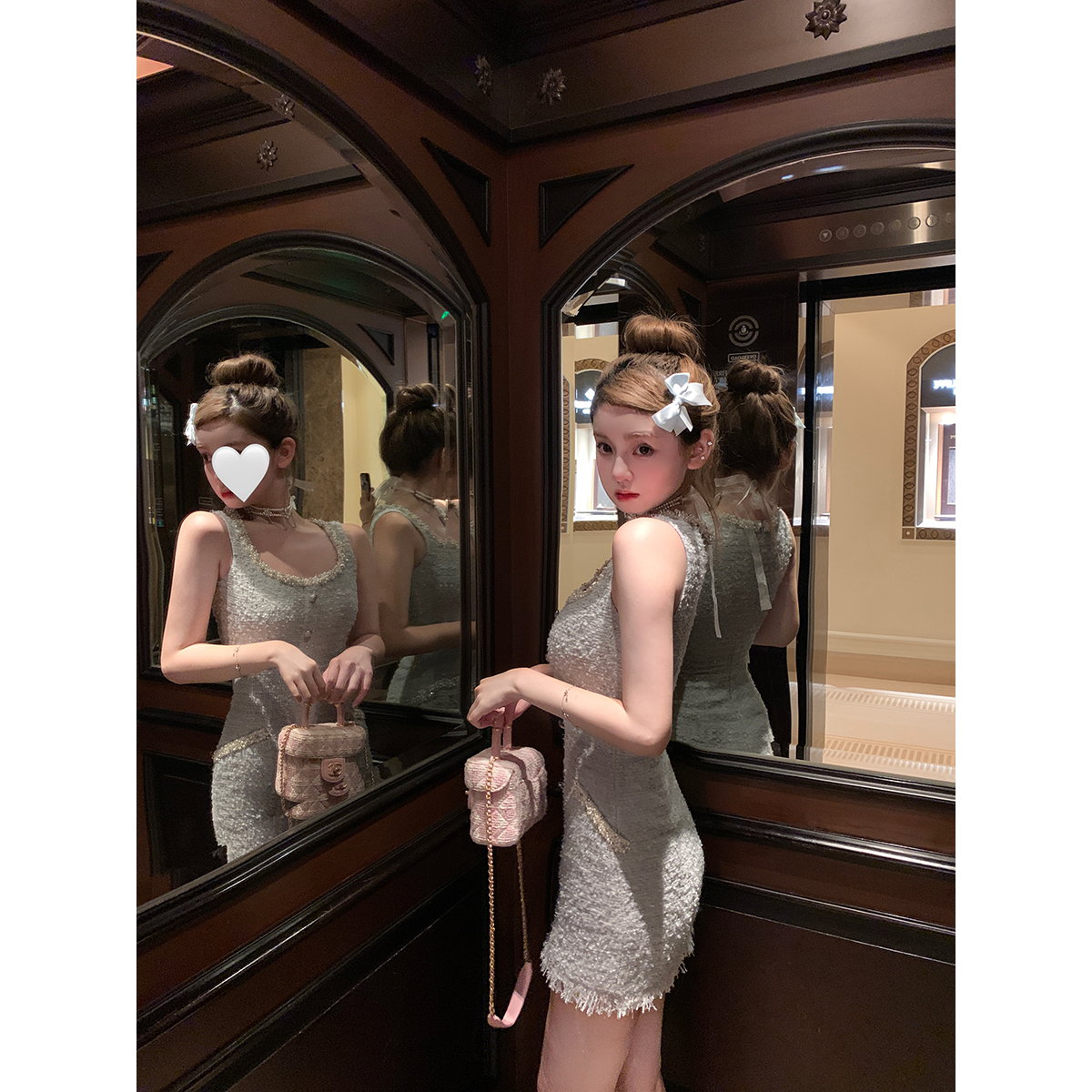你的懒懒llan 私藏冰糖小香 订珠钻链收腰吊带包臀裙2025秋季