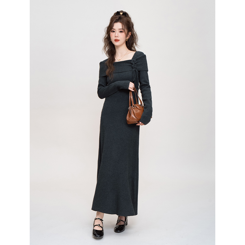 韩版时尚立体花朵长袖针织连衣裙女秋装新款高级感气质修身长裙子