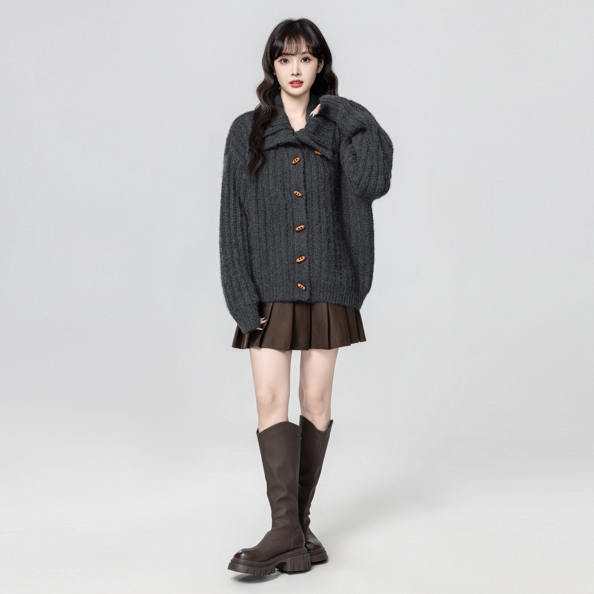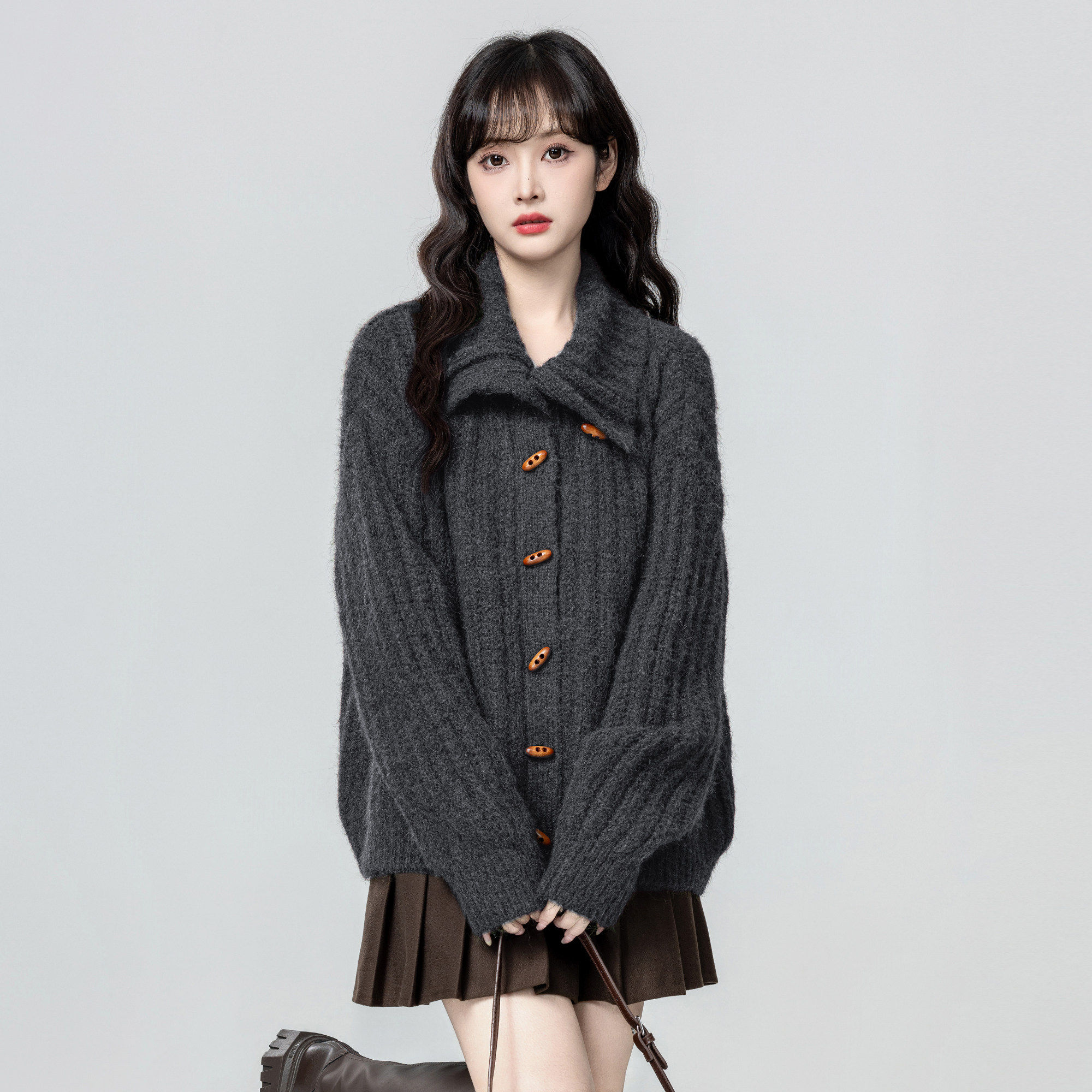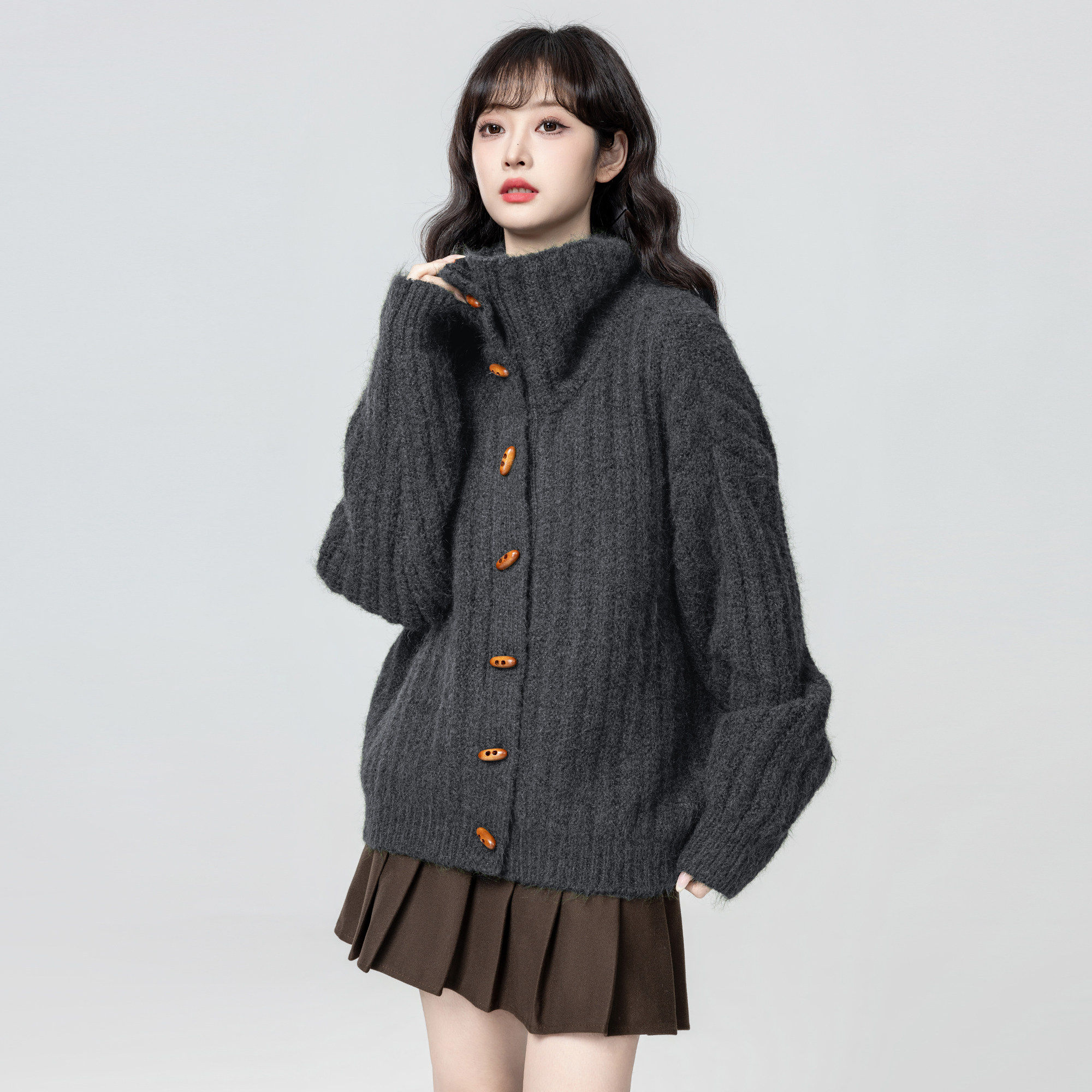 灰色加厚高领毛衣外套女2025秋冬新款牛角扣宽松立领针织开衫上衣