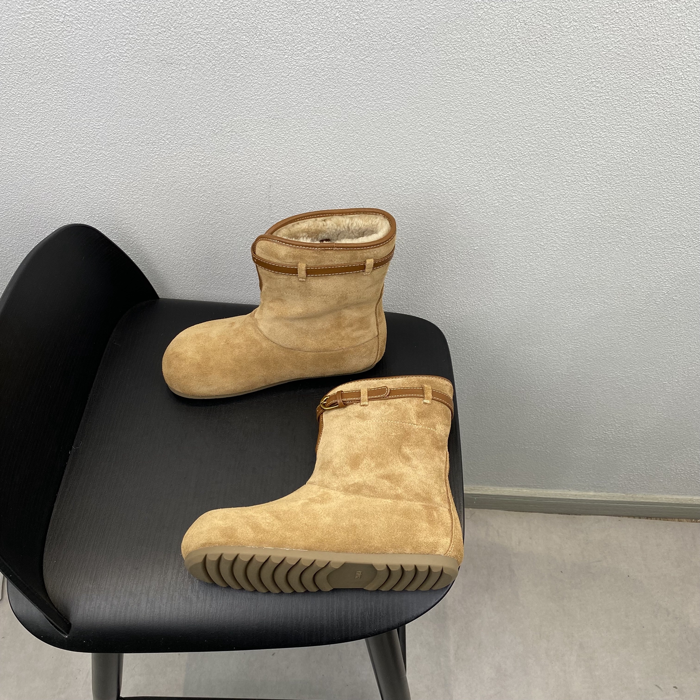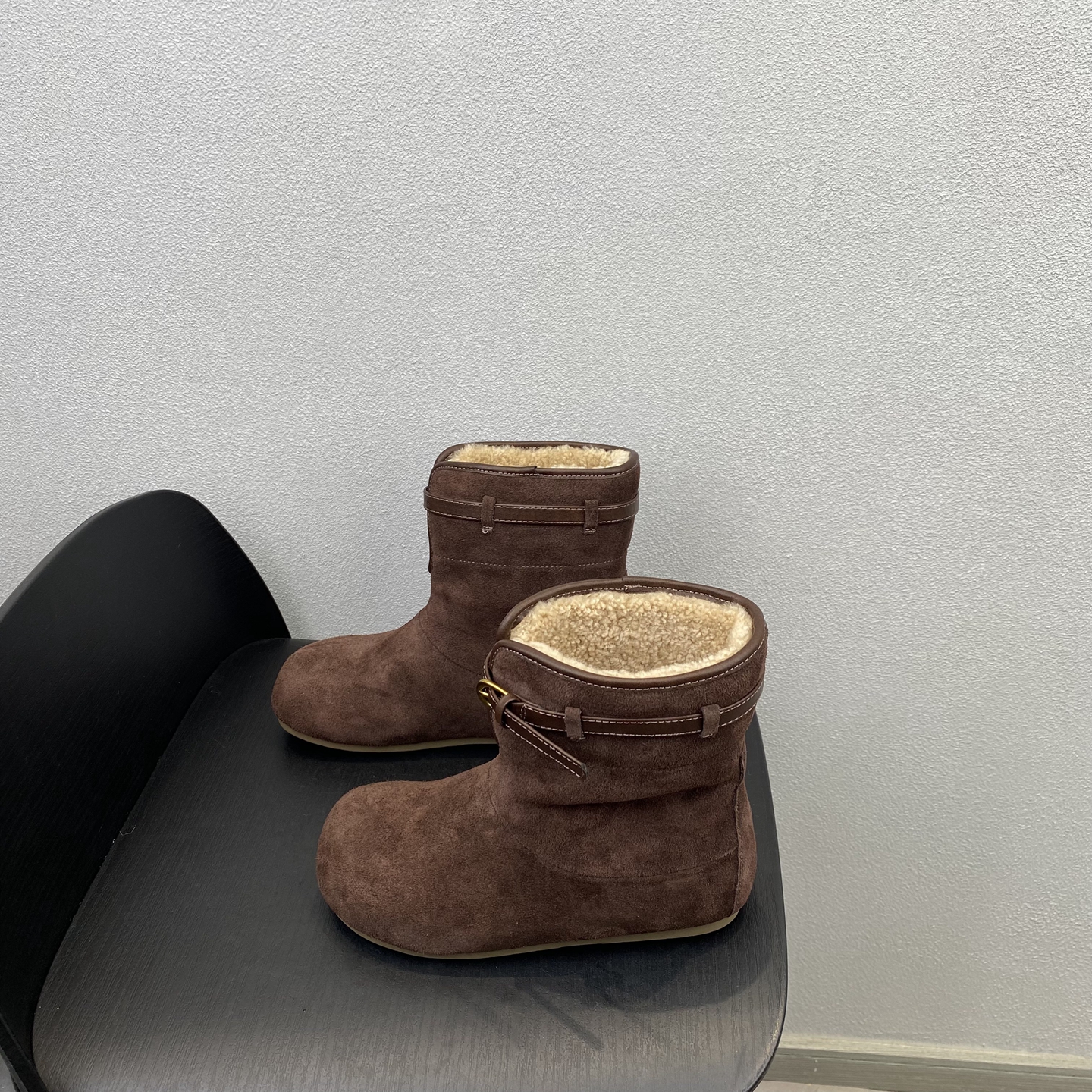 2025冬季时尚百搭圆头舒适女靴子皮带扣平底短靴真皮羊羔毛雪地靴