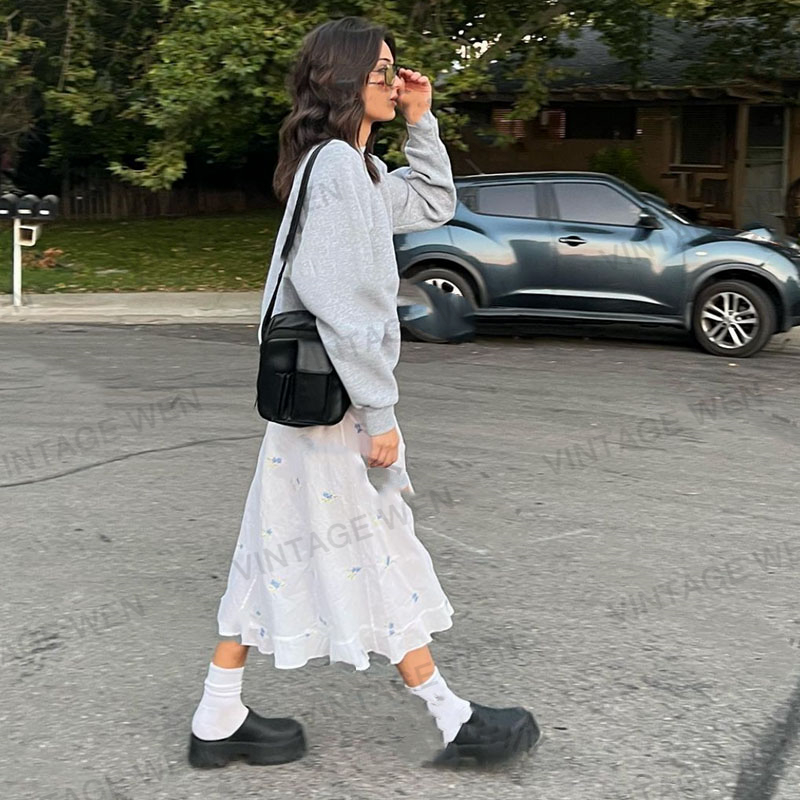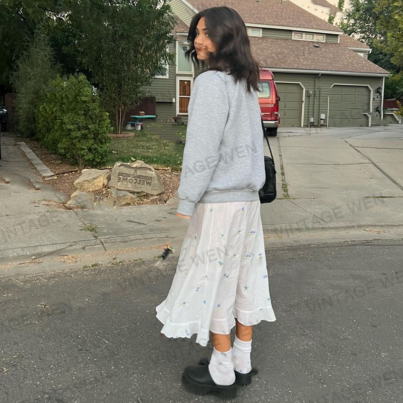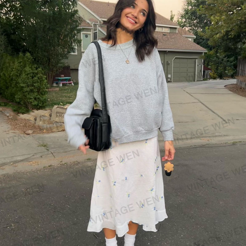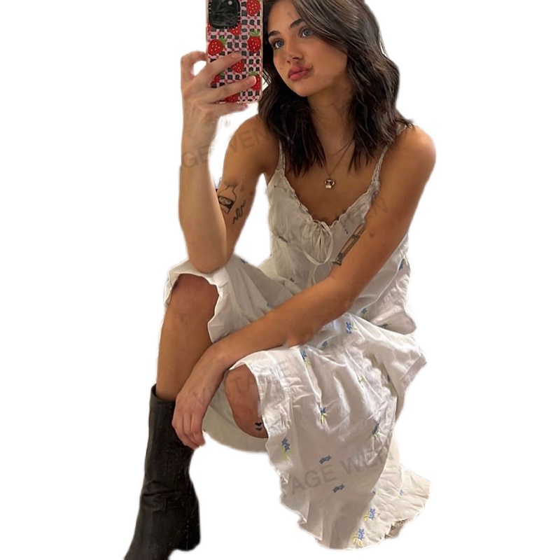 Vintage Wen美式复古甜心白色小碎花内搭吊带连衣裙中长款初恋裙