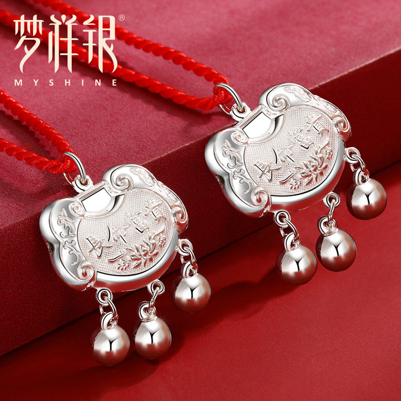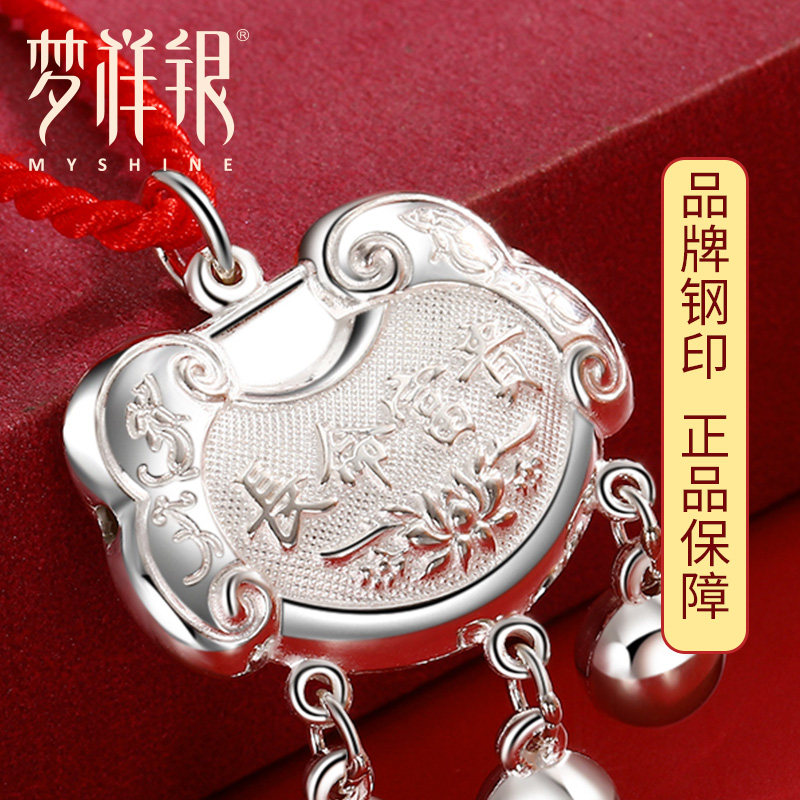 梦祥银长命富贵红绳925银婴儿长命锁儿童宝宝平安银锁满月礼物