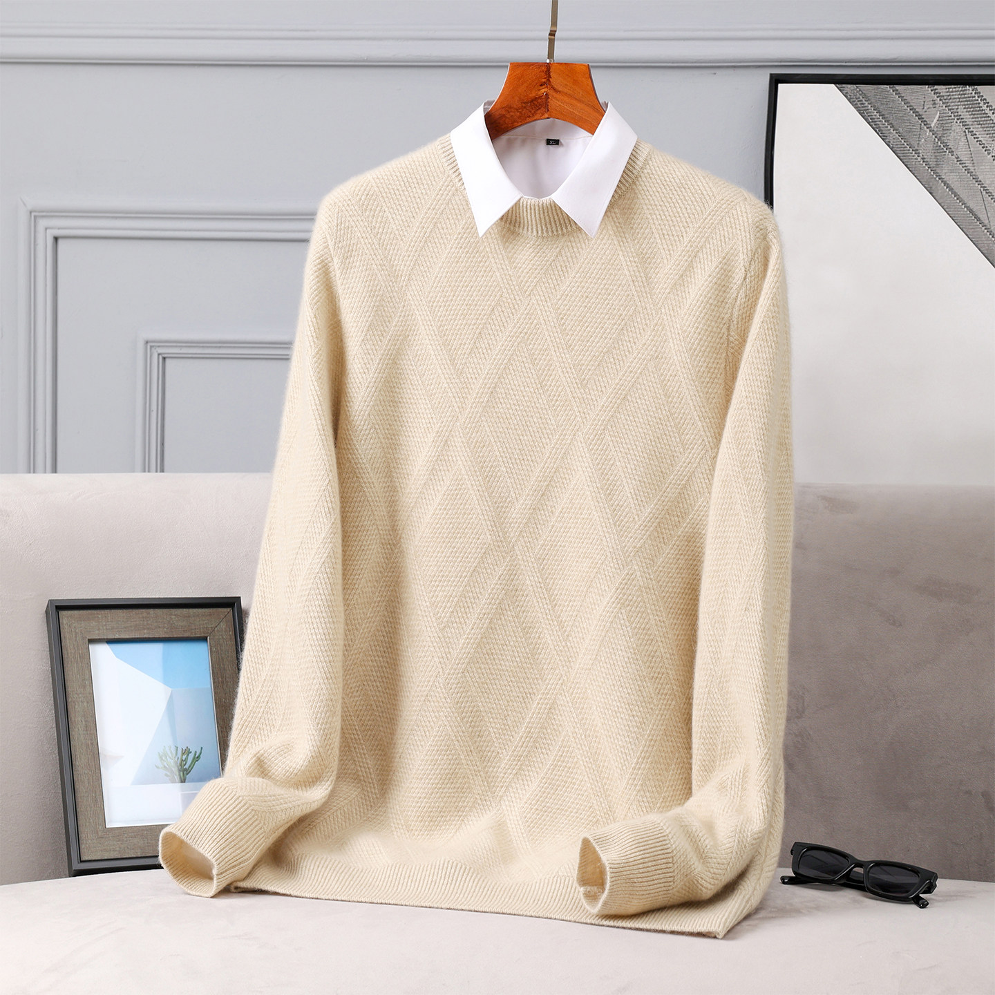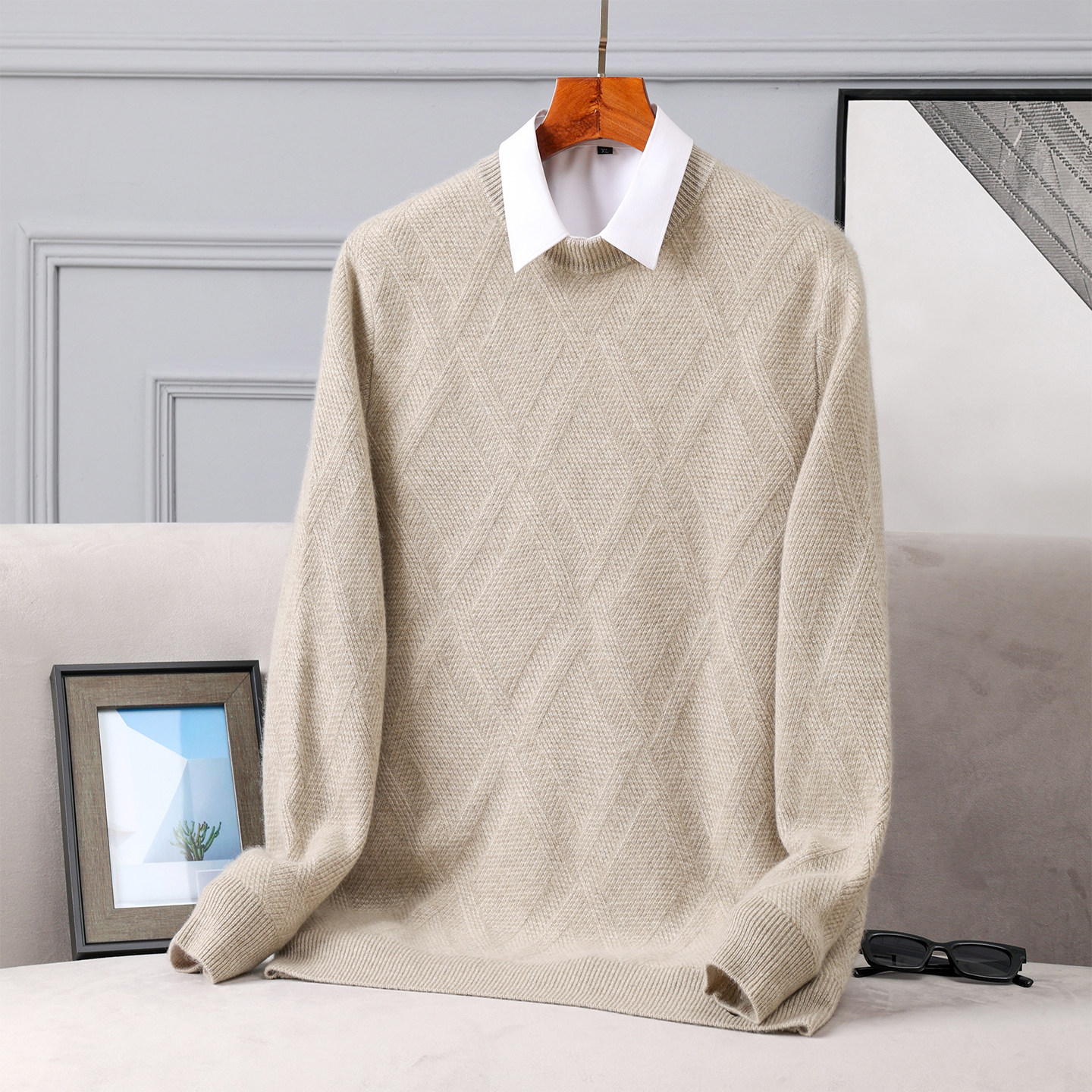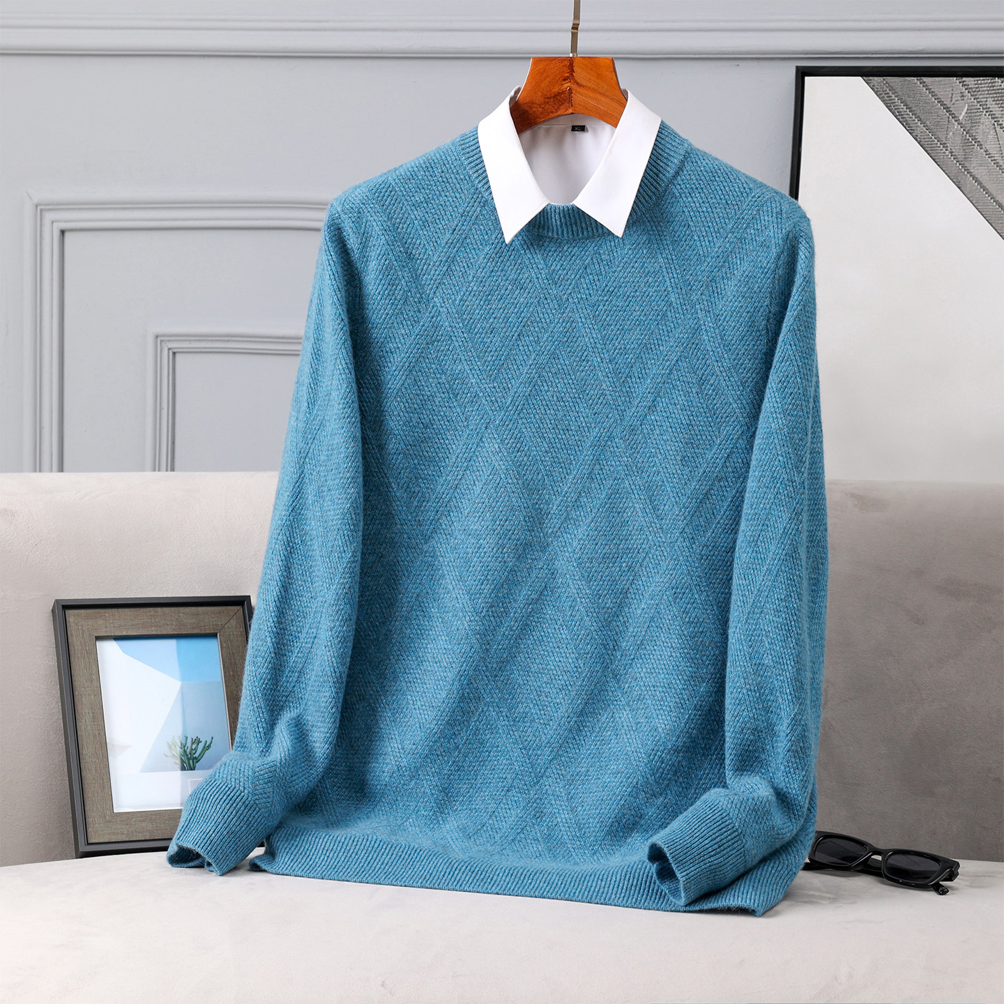 男士加厚羊绒衫 迪瑞羊100%山羊绒双股毛衣圆领上衣保暖提花套头