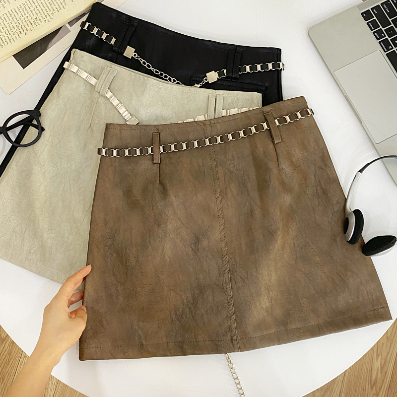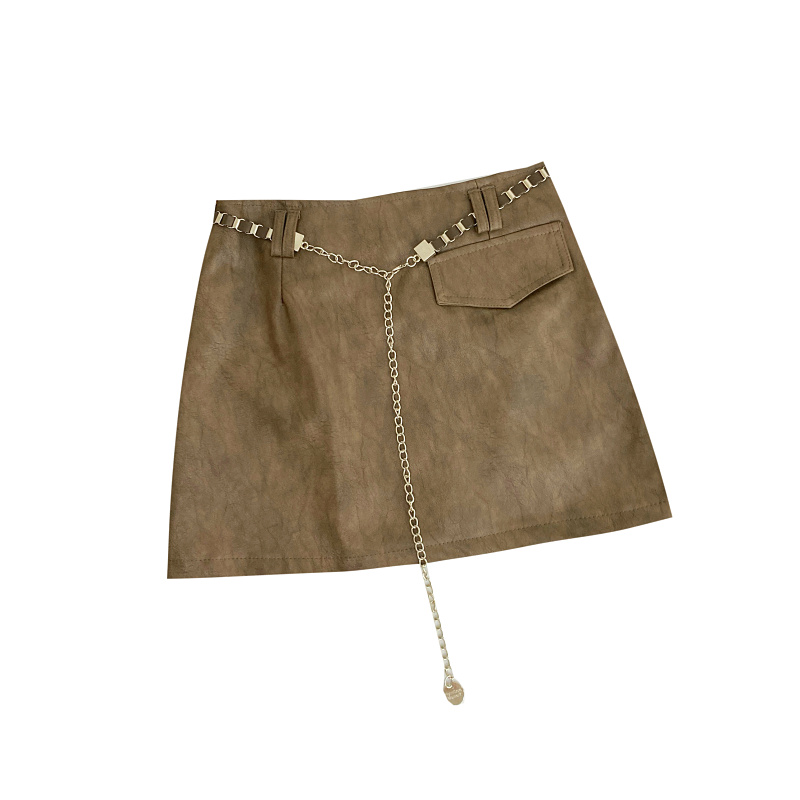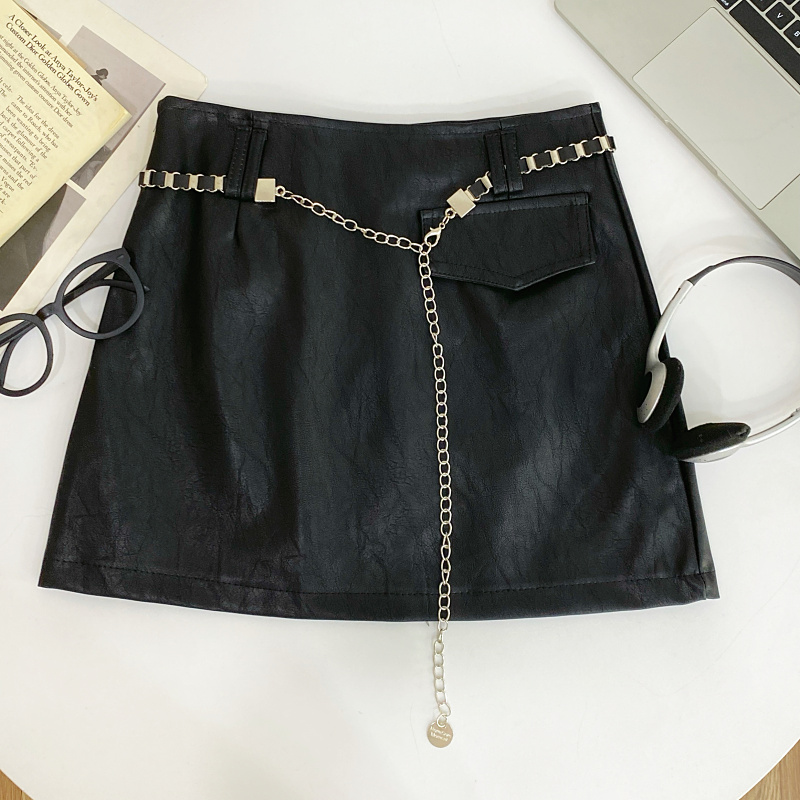 配链条PU皮高腰防走光半身裙女2025秋冬新款假口袋a字裙包臀短裙
