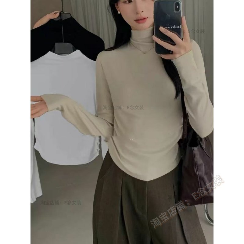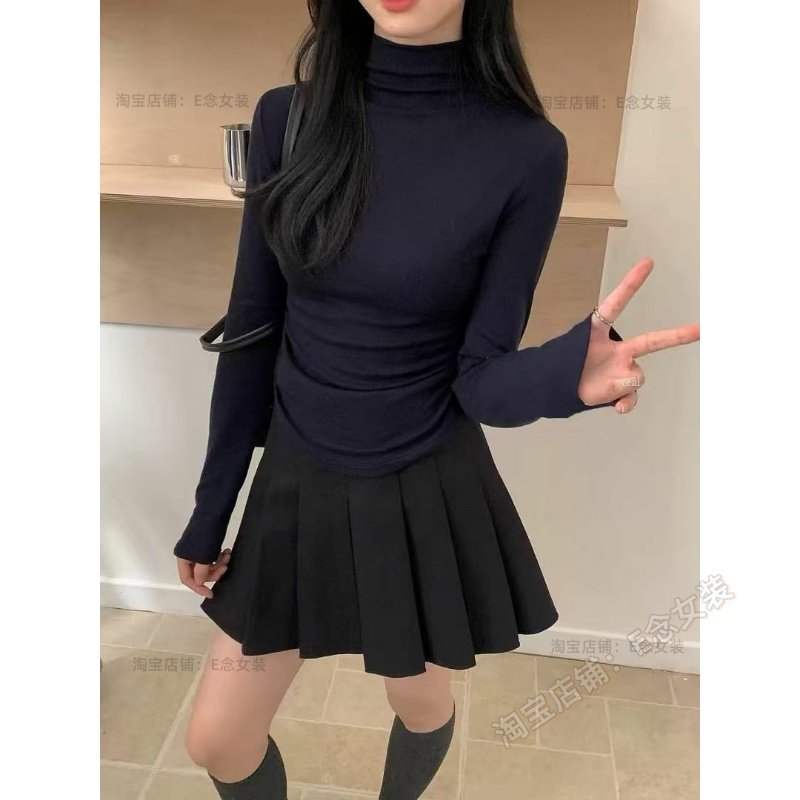 E念8020冬季新款半高领加绒长袖打底衫女双侧皱褶收腰显瘦T恤上衣