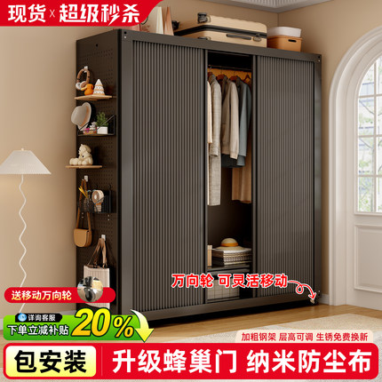 洞洞板衣柜家用卧室出租房用货架衣橱简易组装新型钢制推拉门柜子