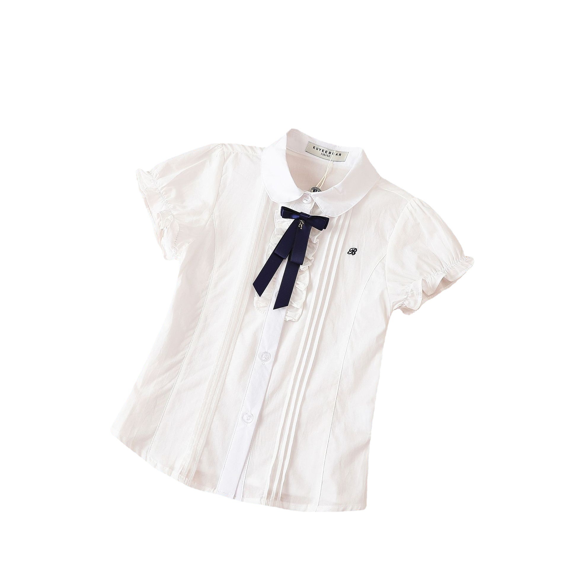 女童短袖衬衫现货夏季韩版中大童白色蝴蝶结纯棉短袖翻领儿童衬衣