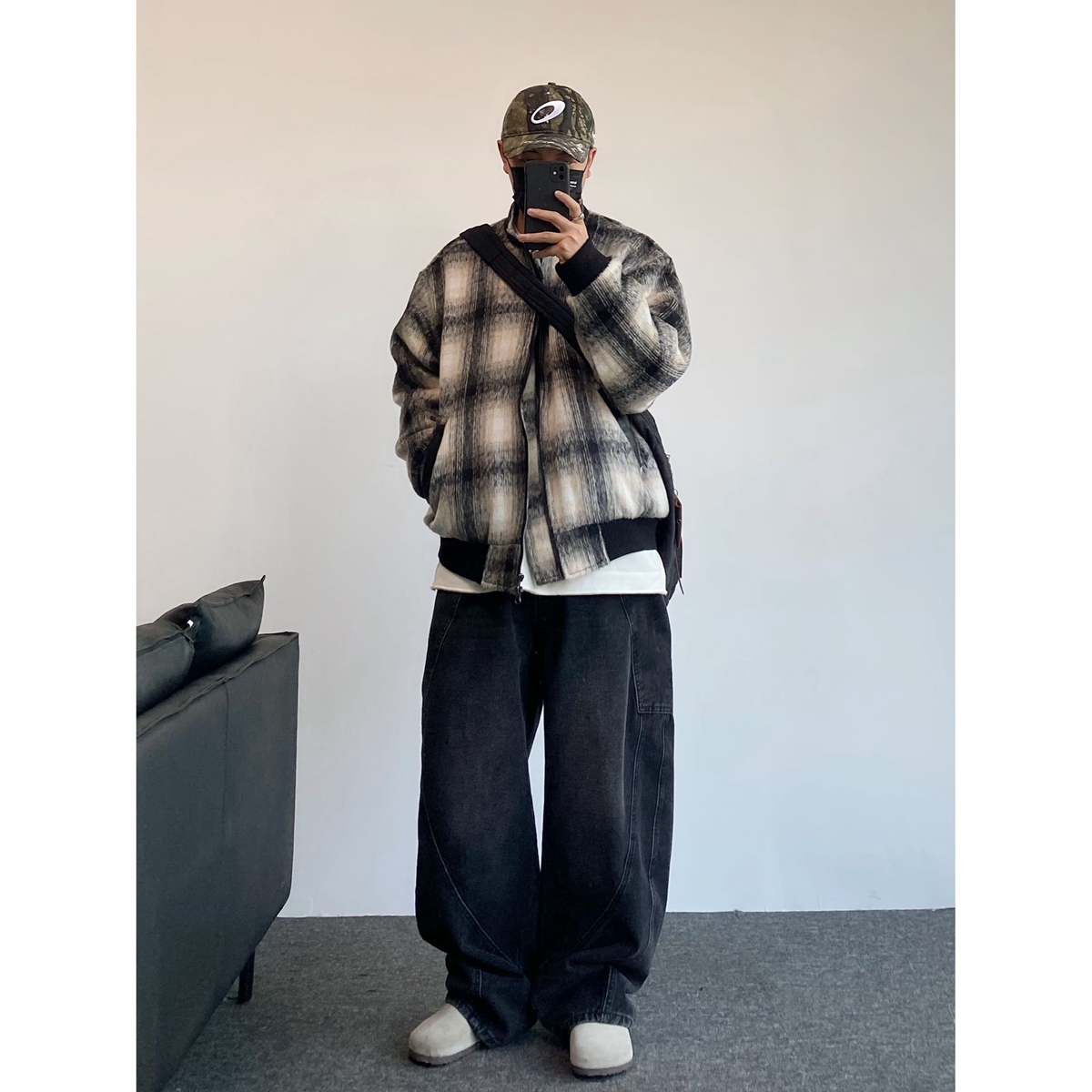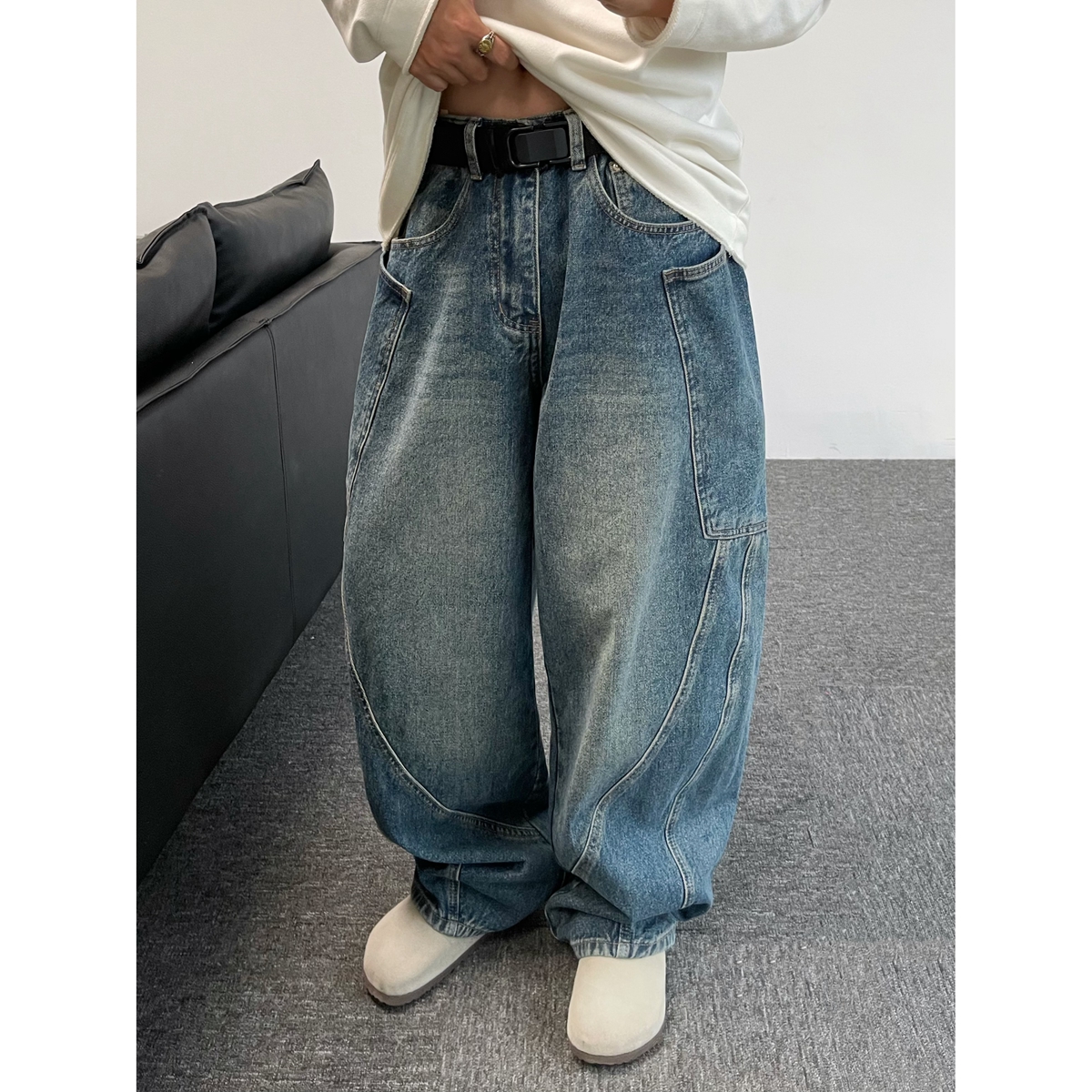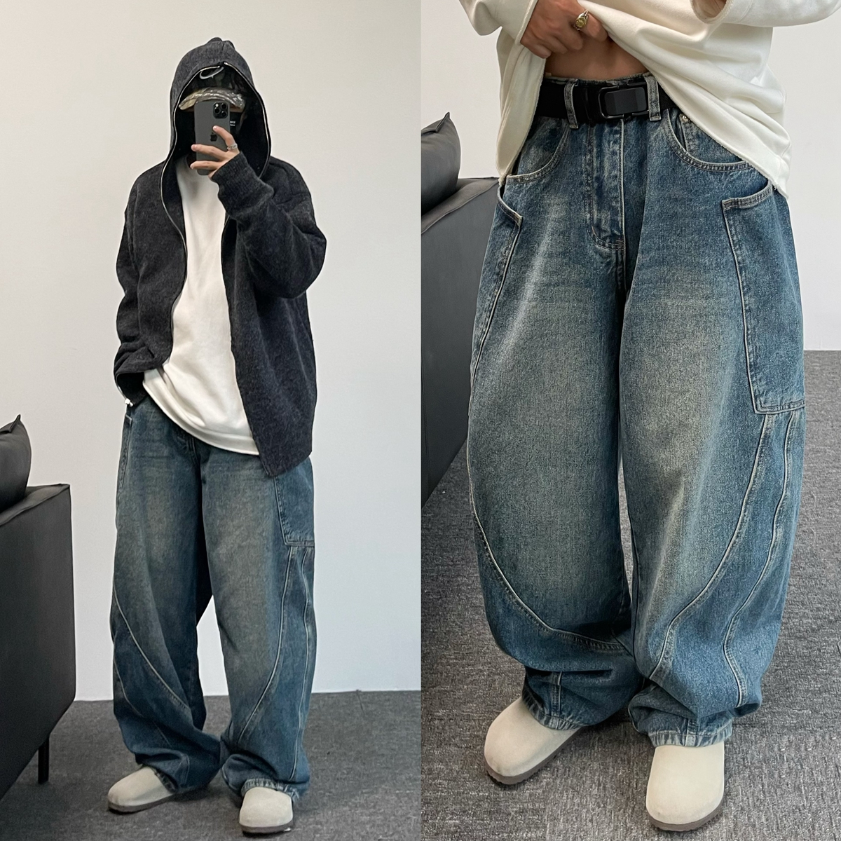 SMDSK EVDY美式复古水洗大口袋弯刀牛仔裤男直筒阔腿宽松休闲长裤