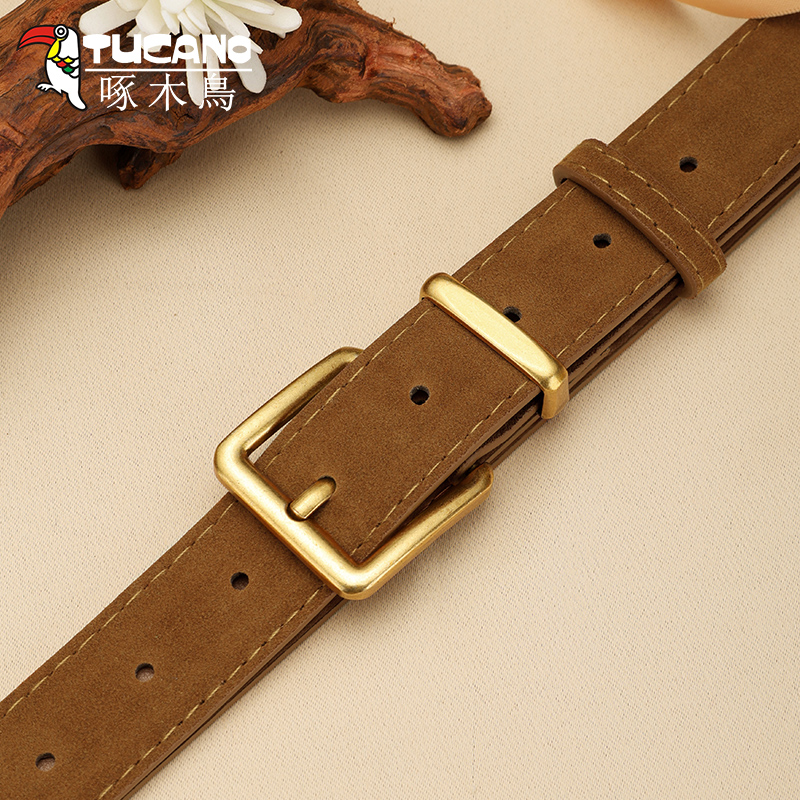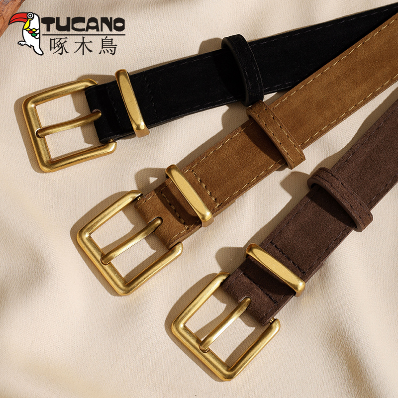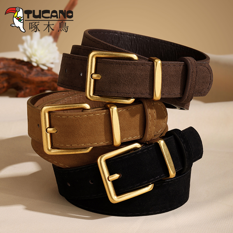 啄木鸟皮带女士2025新款真皮美拉德复古绒面针扣牛皮配牛仔裤腰带