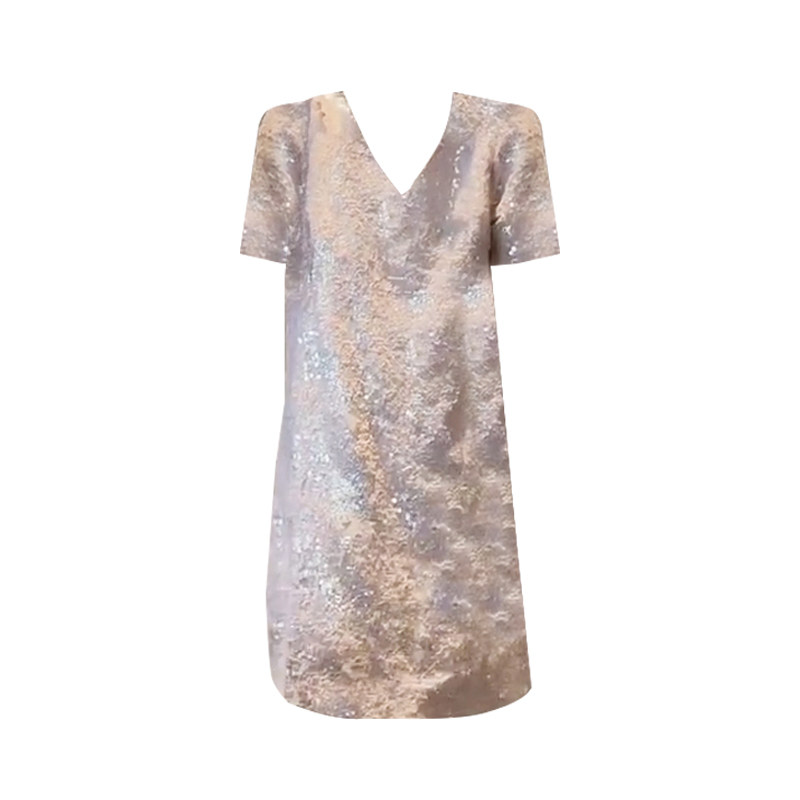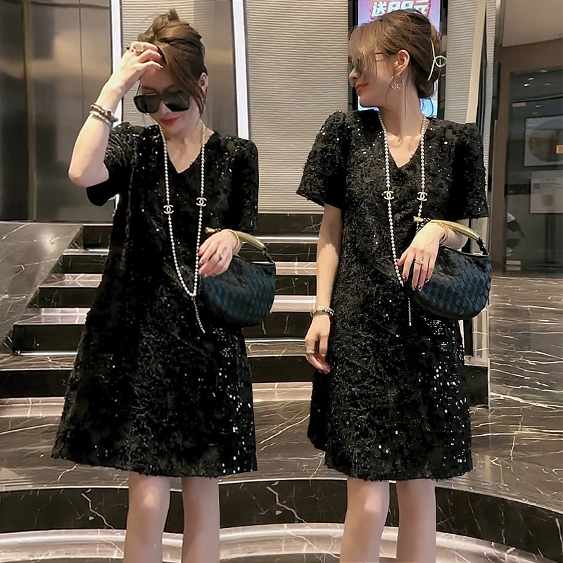 2025春夏新款时尚大码轻奢亮片V领连衣裙欧洲站韩版洋气显瘦女裙