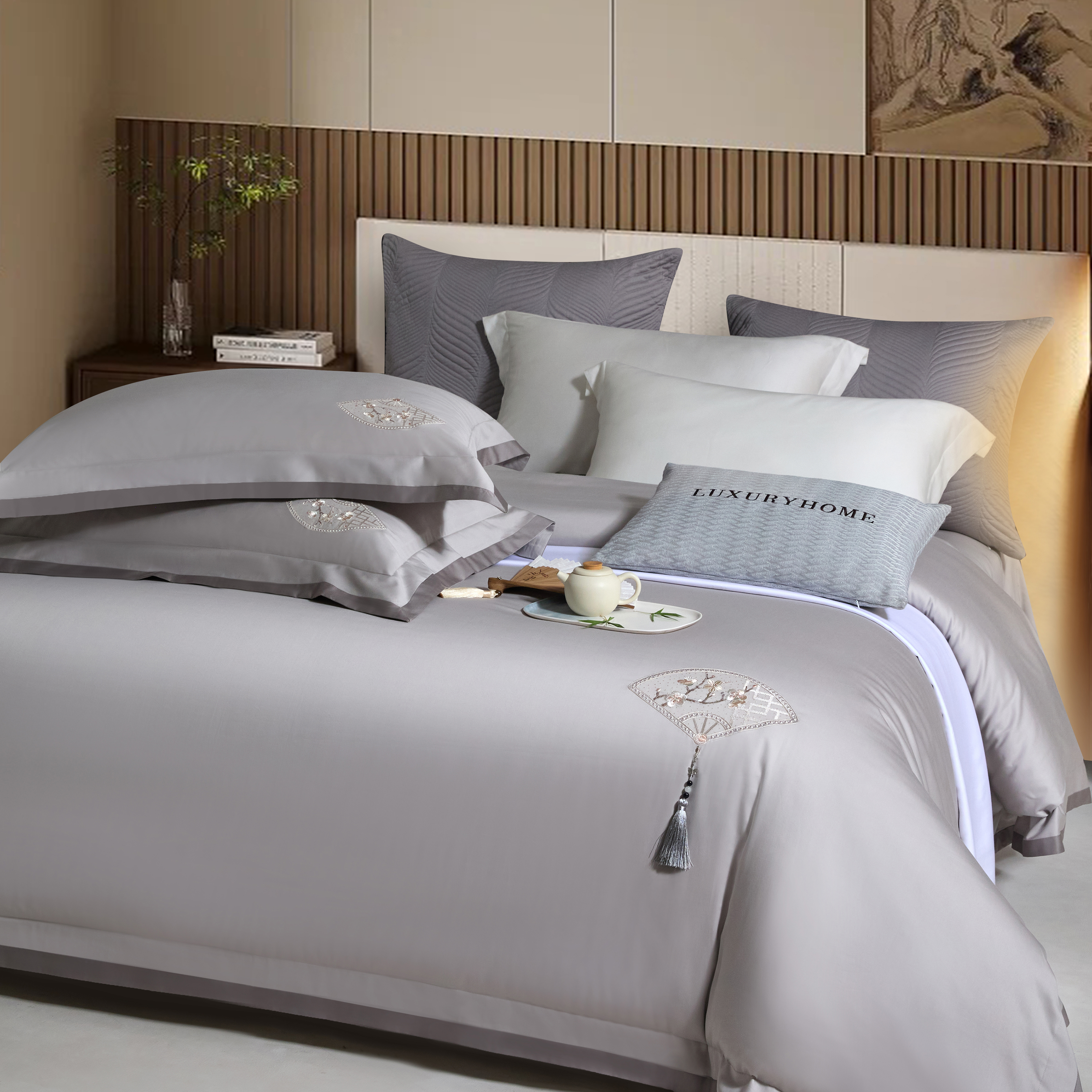新中式床上用品四件套全棉纯棉绣花高级感被套床单粉紫色四季通用
