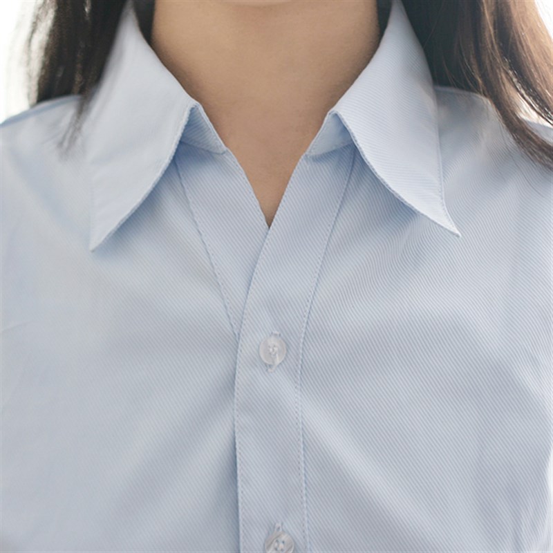 包邮白衬衫女修身收腰V领细竖条纹衬衣短袖职业OL长袖工作服浅蓝