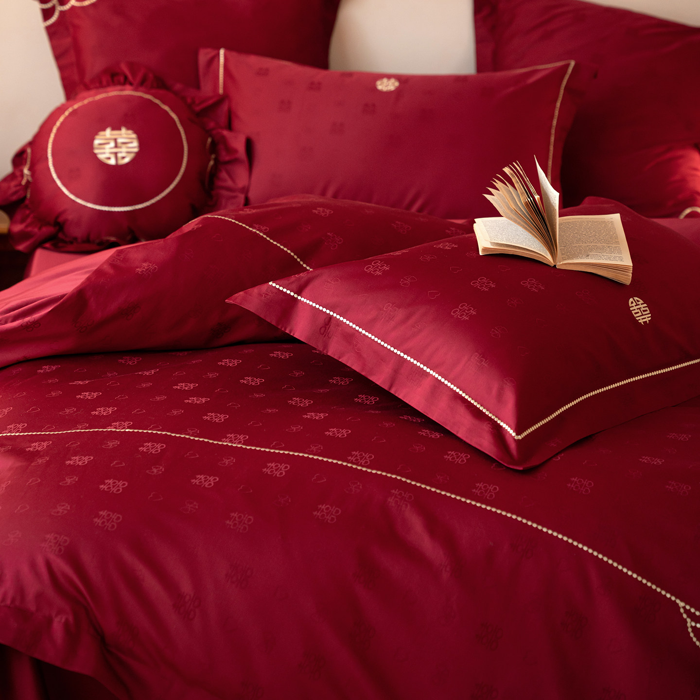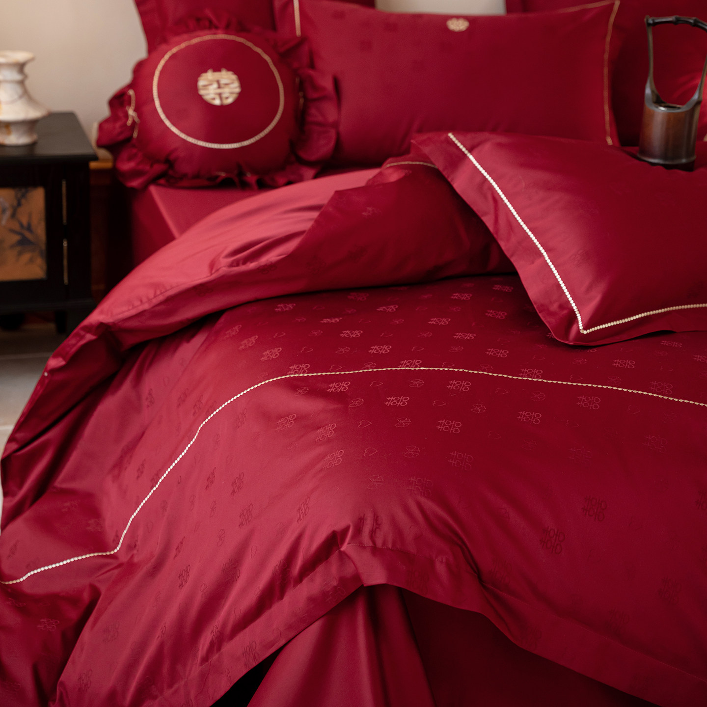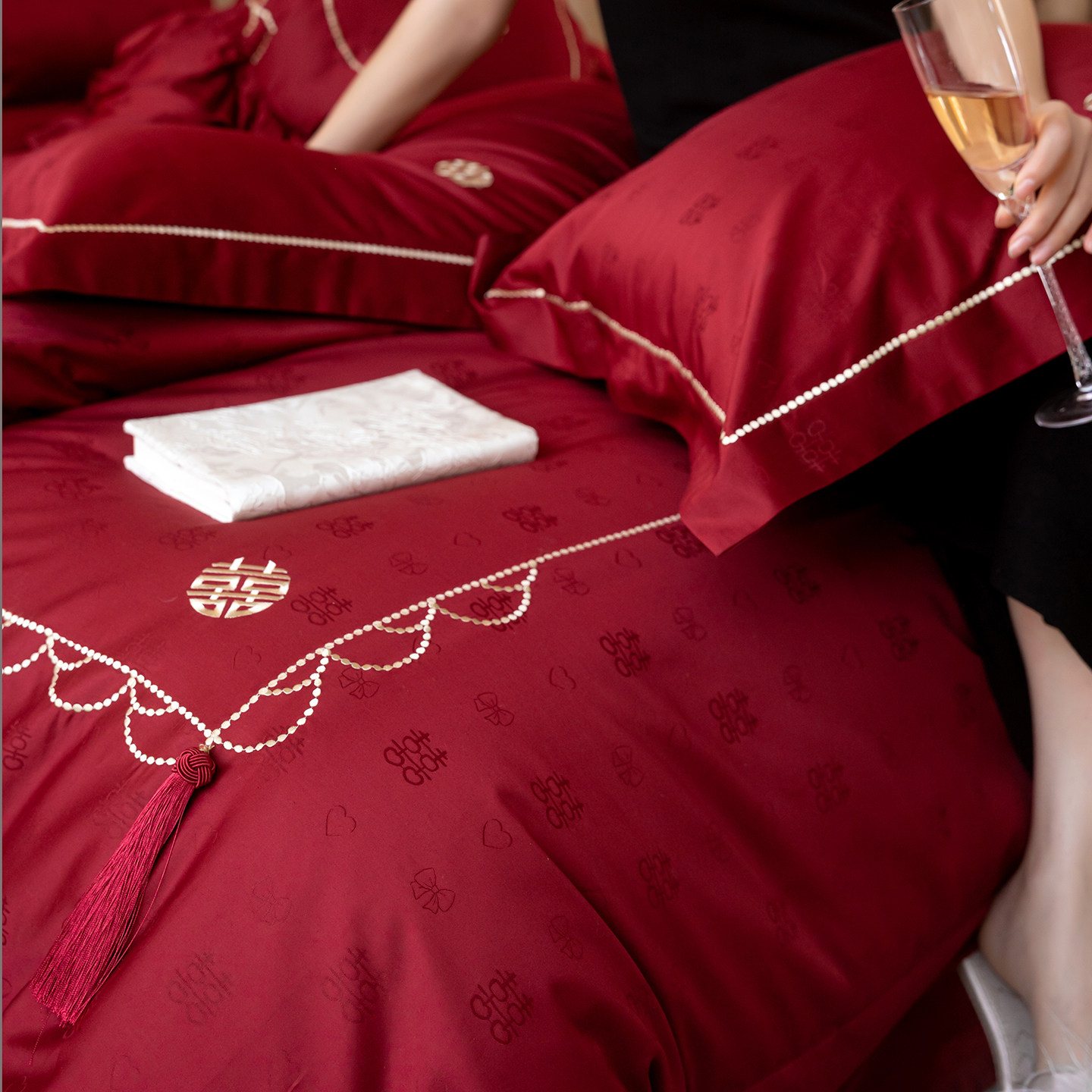 喜结同心婚庆四件套100S长绒棉全棉喜字被套红色结婚床单床上用品