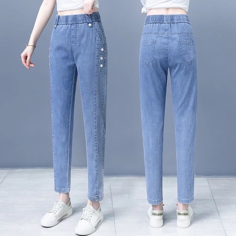 天丝牛仔裤女八分秋季薄款高腰直筒宽松显瘦小个子大码冰丝哈伦裤