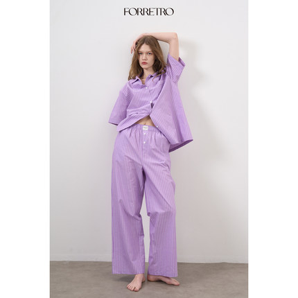 FORRETRO 24春夏北欧风极简紫色条纹短袖短裤全棉家居服可外穿