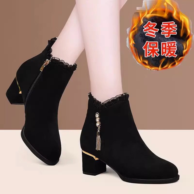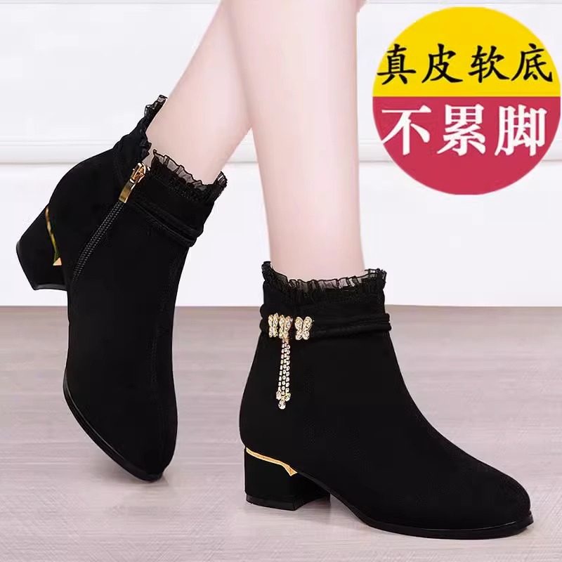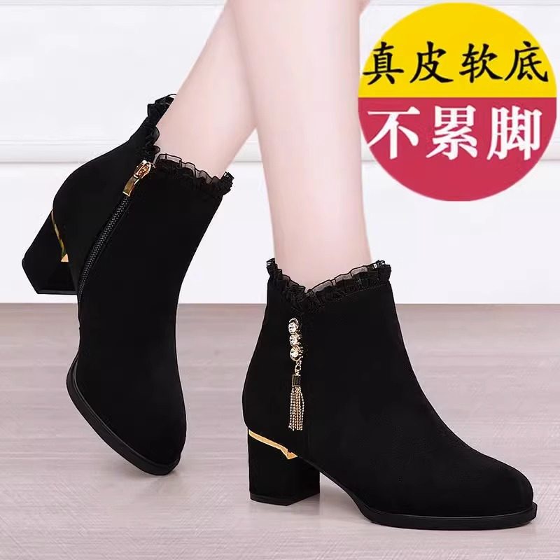 品牌断码真皮中跟短靴女2025秋冬新款粗跟蕾丝女士单靴磨砂棉靴子