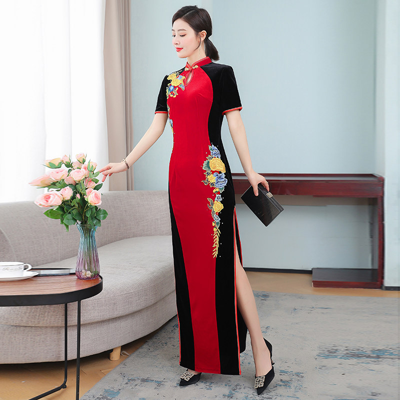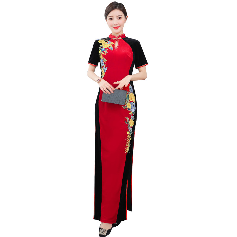 奥黛改良旗袍连衣裙2025新款复古中国风长款高端舞台走秀演出服冬