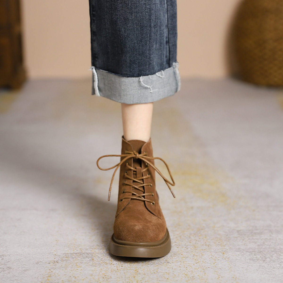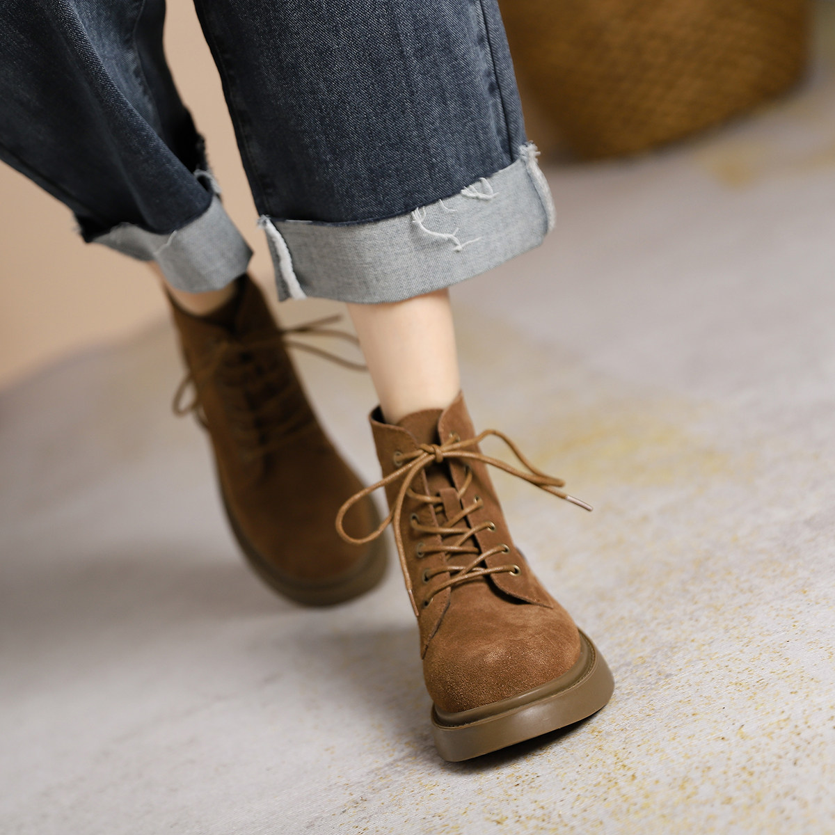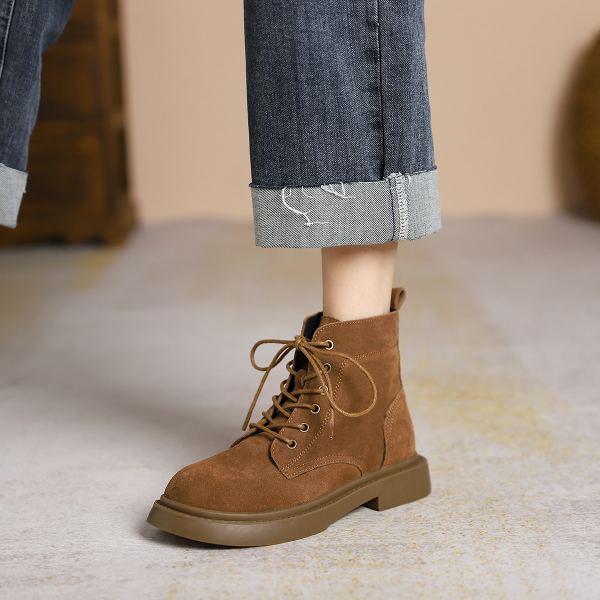 棕色圆头系带平底英伦风真皮短靴