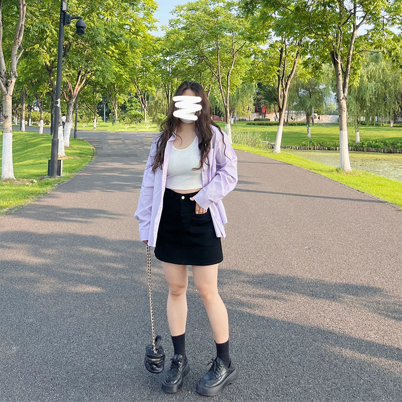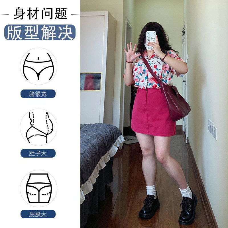 300特大码高腰玫红色牛仔短裙女