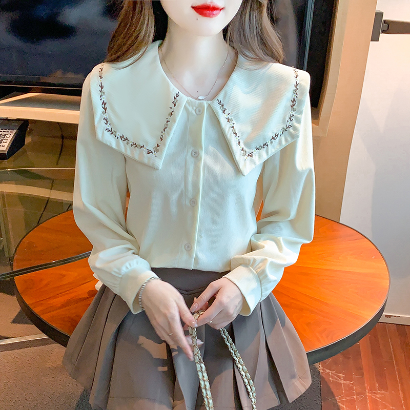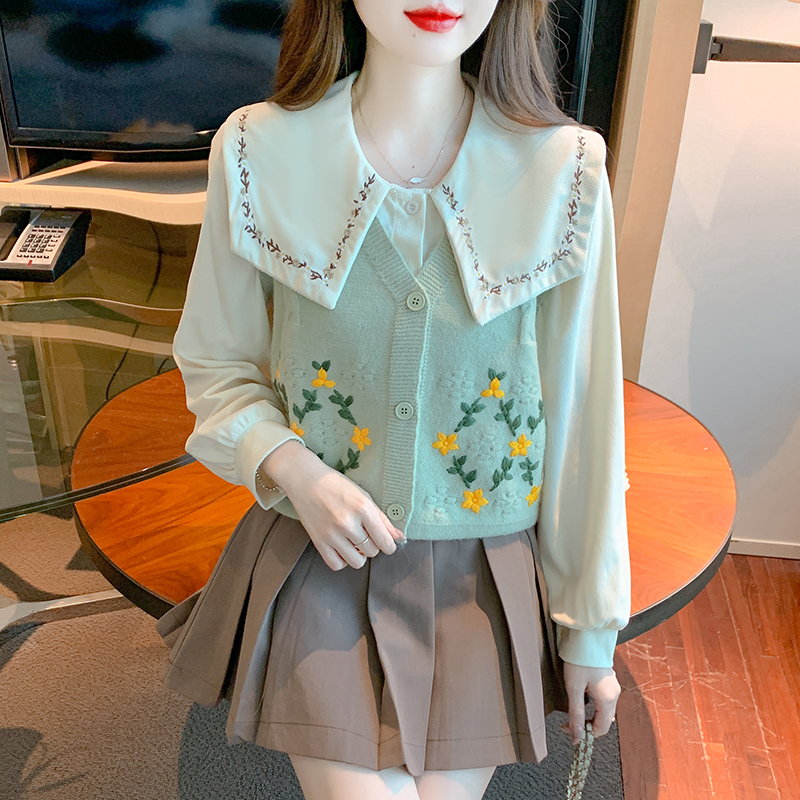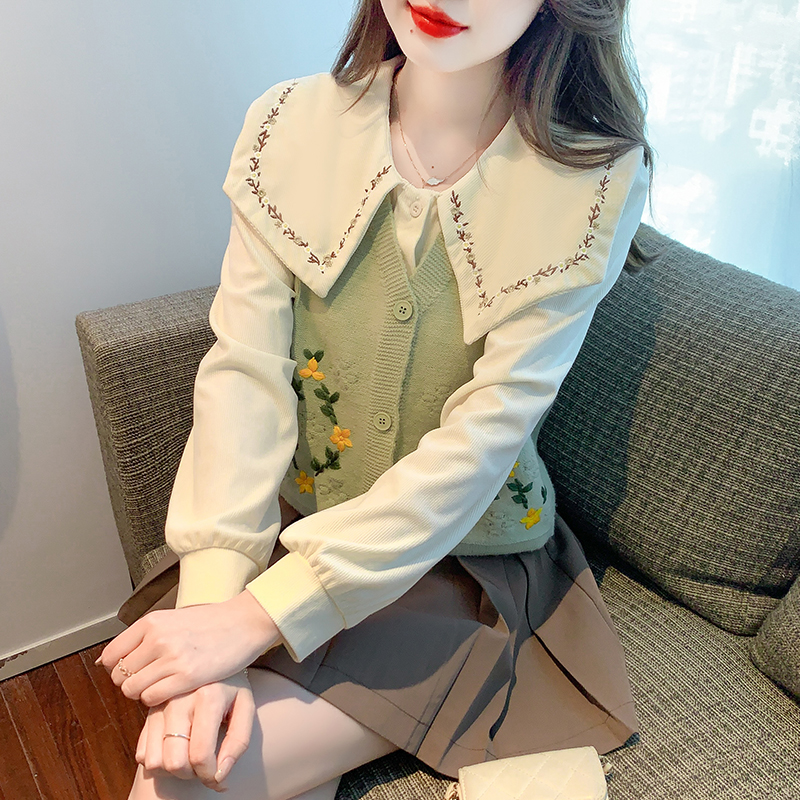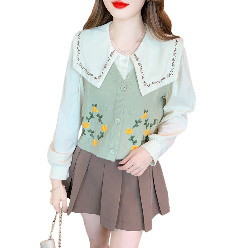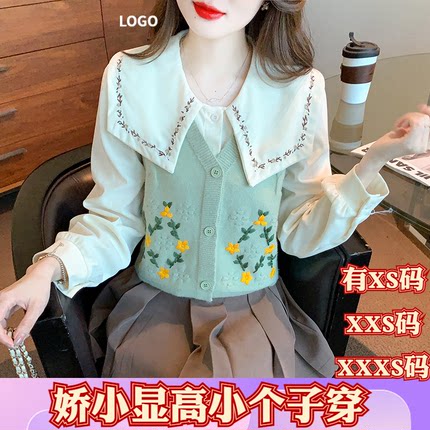 小个子女装秋装显高加小码XXXS150cm长袖衬衫+绣花针织马甲两件套