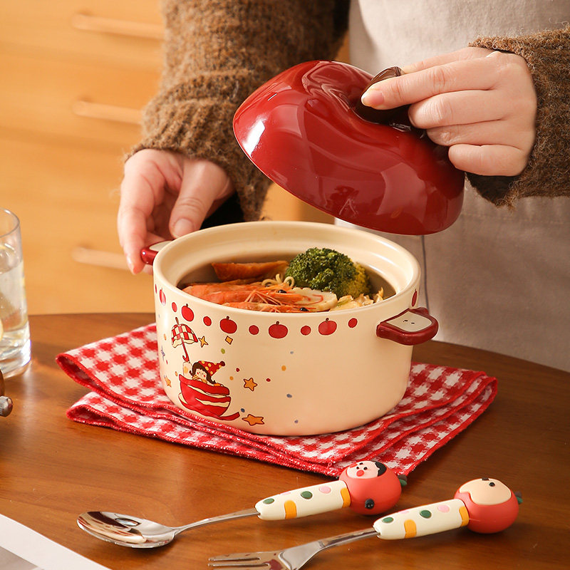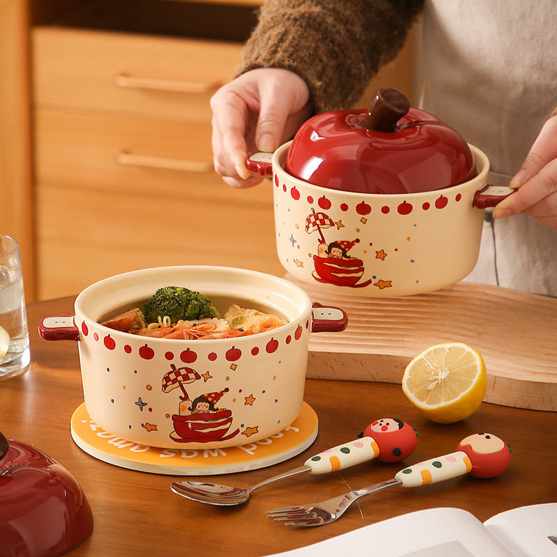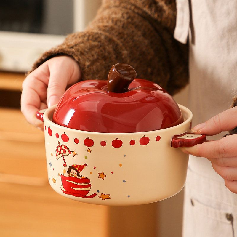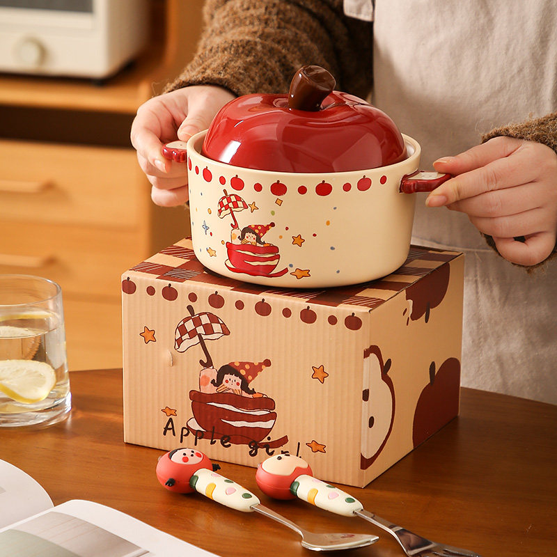 红苹果女孩泡面碗高颜值带盖大容量可爱陶瓷早餐碗送女生生日礼物