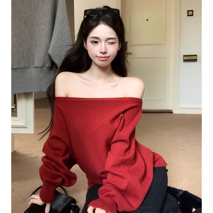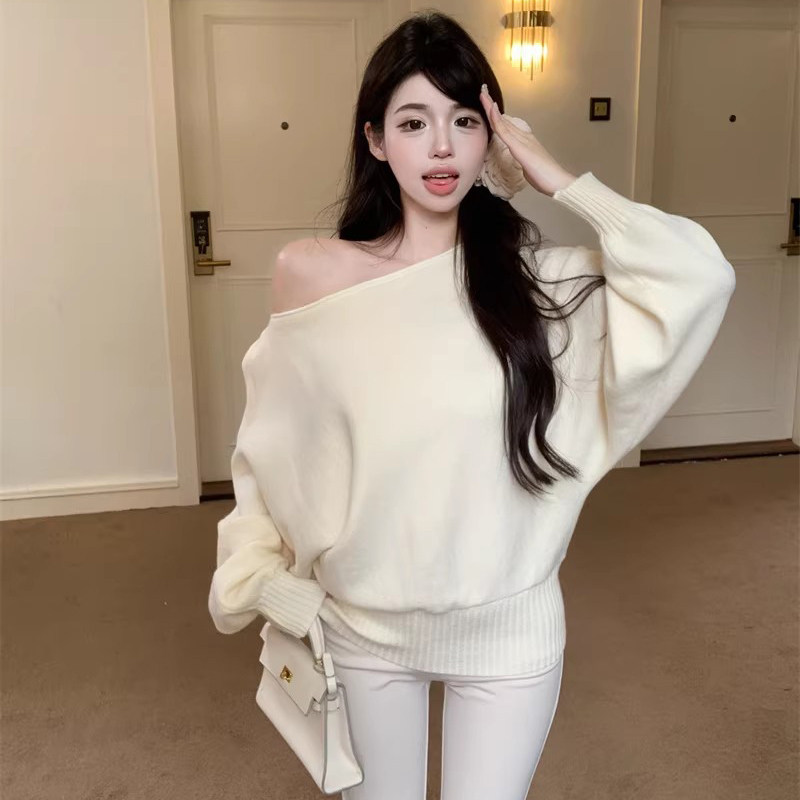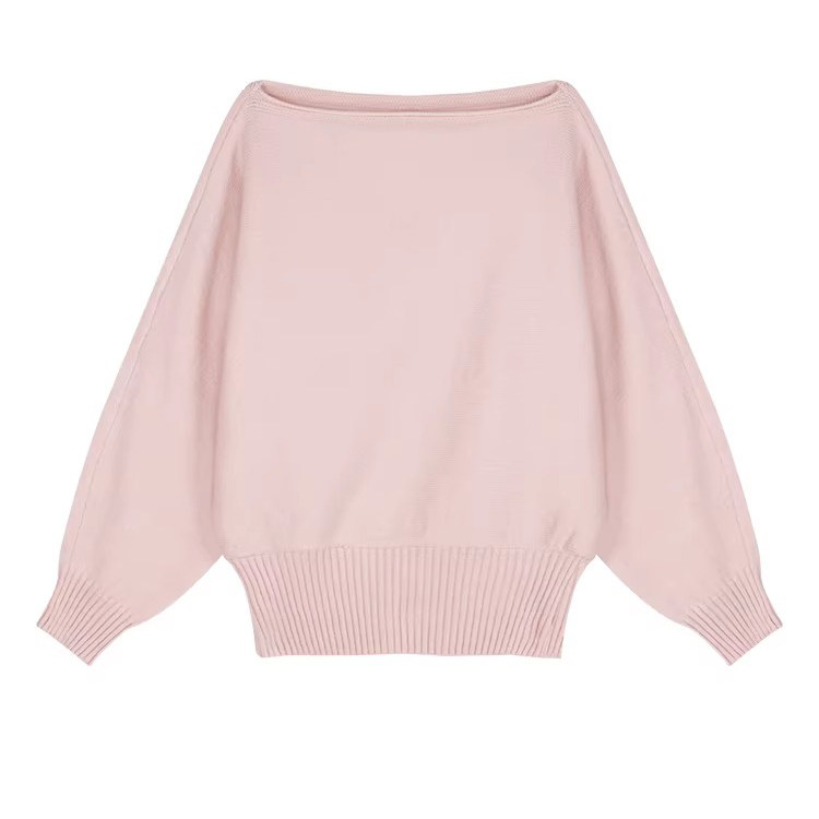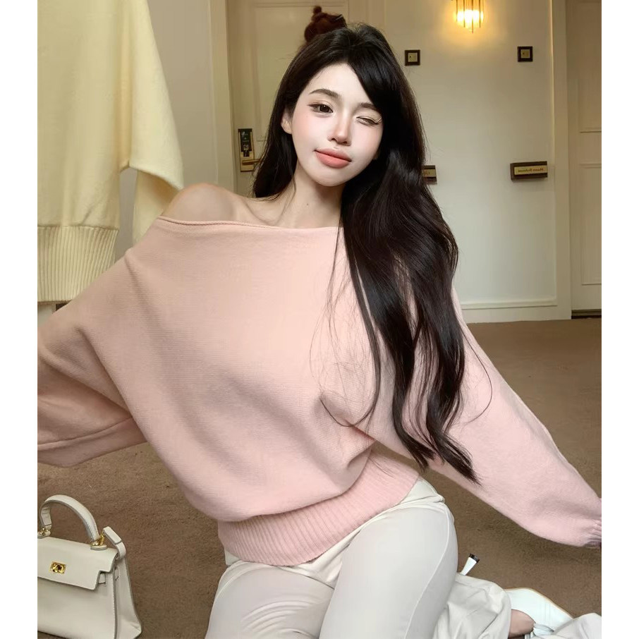 粉色蝙蝠袖斜肩针织衫女冬季一字肩宽松套头毛衣温柔慵懒长袖上衣