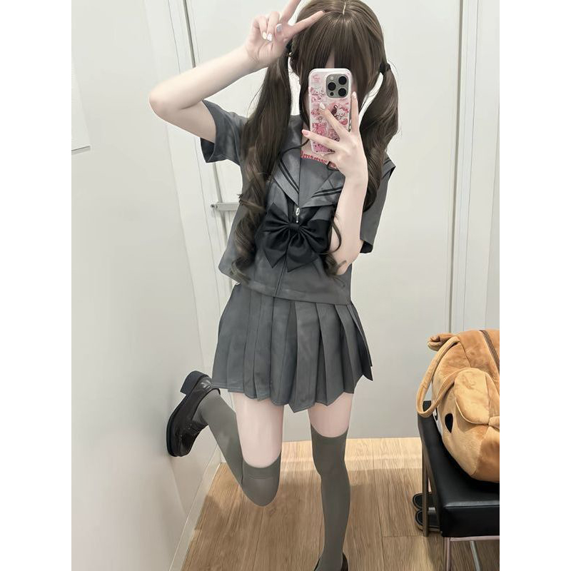 JK灰色二本套装新款学院风穿搭水手服短袖长袖衬衫制服校供感JK裙