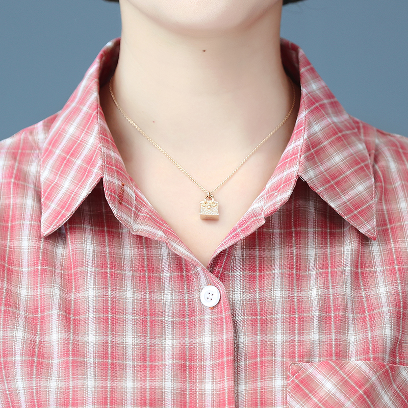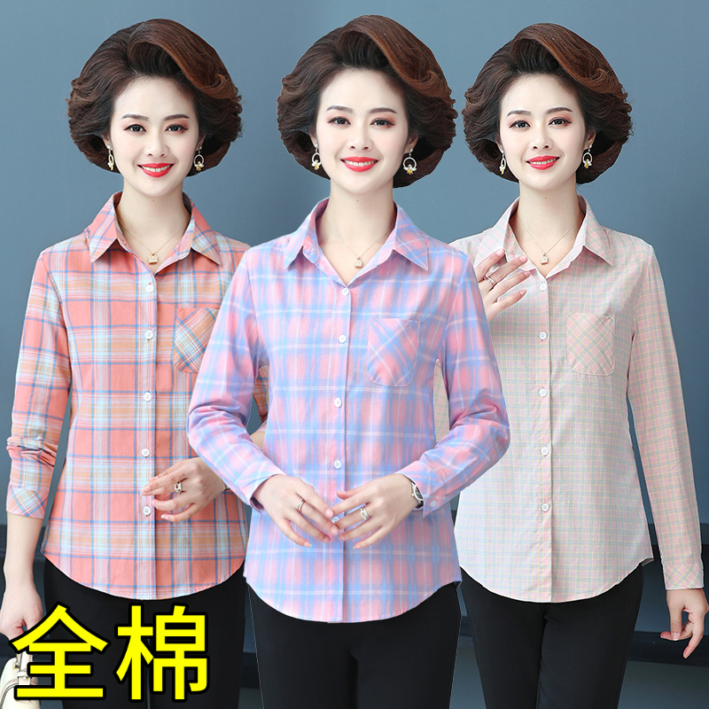 2021年春季新款宽松妈妈装格子衬衫全棉长袖中老年女士纯棉衬衣