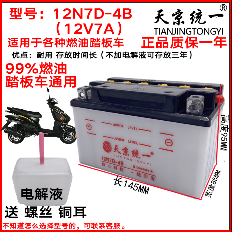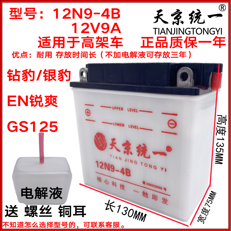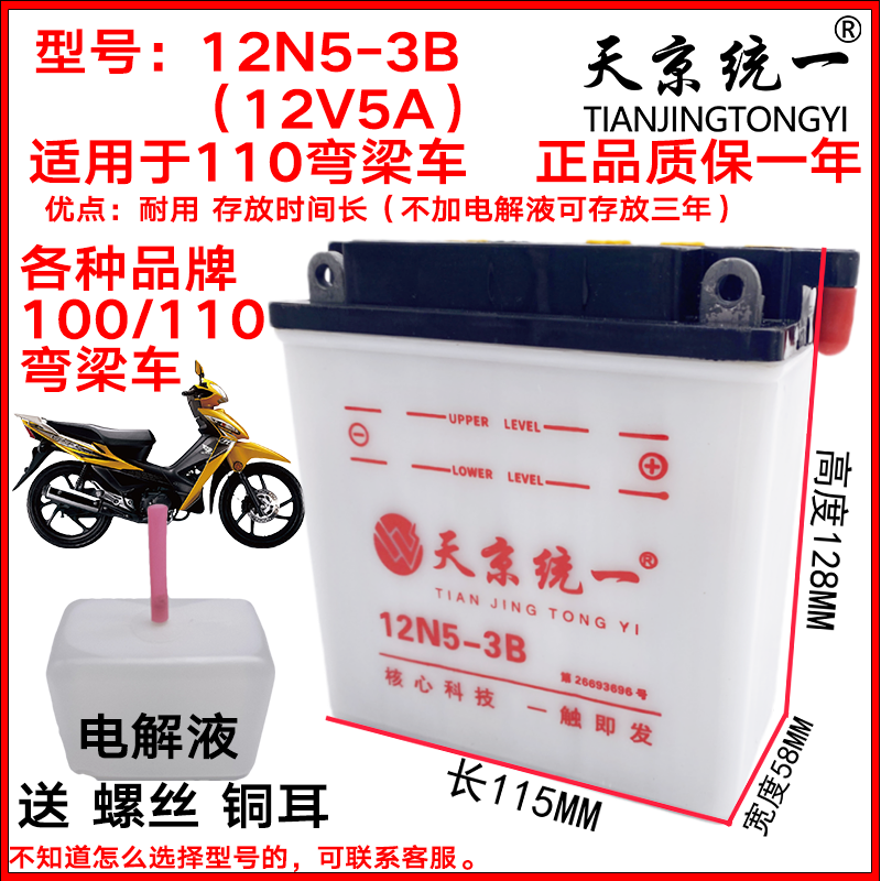 天京统一12N5A7A9A摩托车电瓶110弯梁125/150骑士踏板铅酸水电池