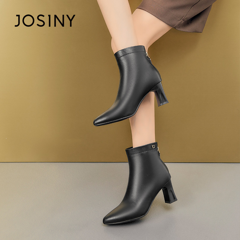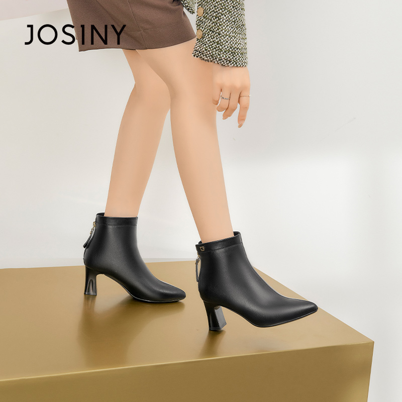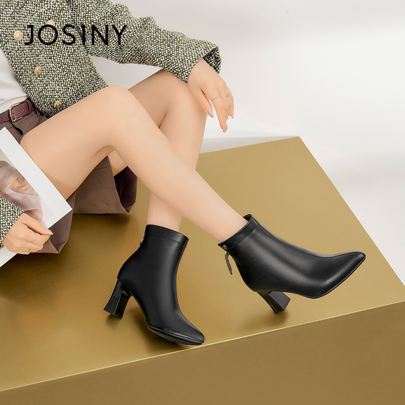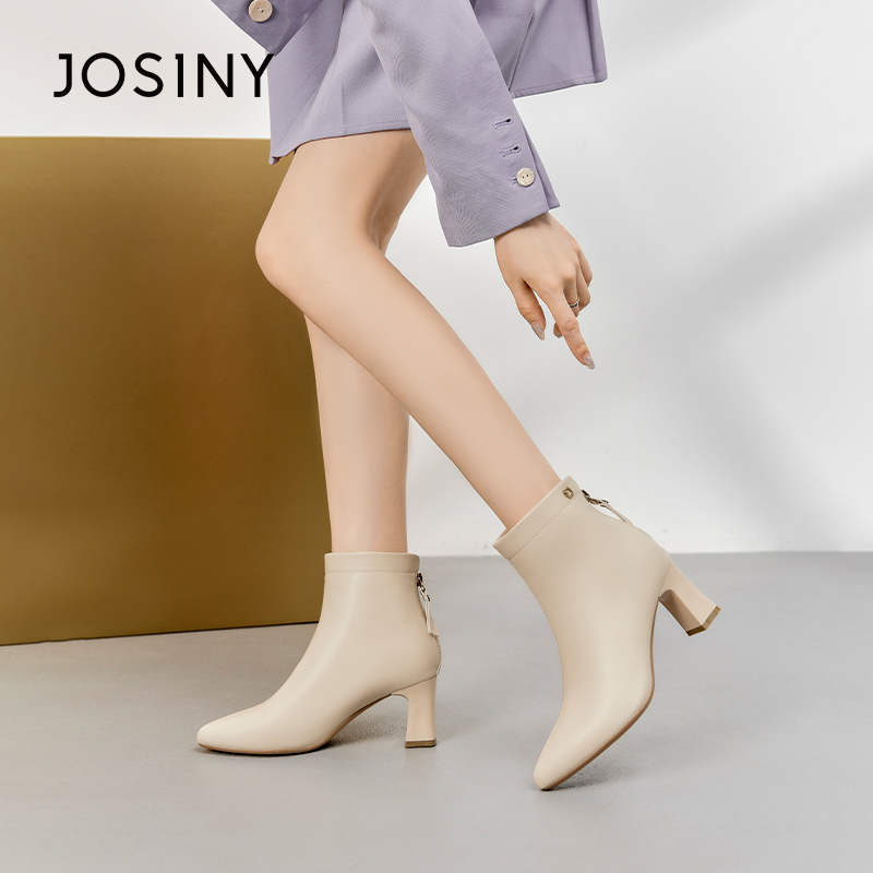 卓诗尼冬季女士短筒靴子圆头粗高跟加绒后拉链及踝韩版时装休闲