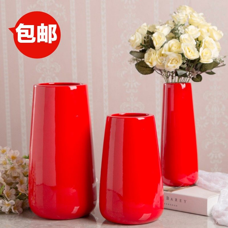 红色陶瓷花瓶三件套 结婚喜庆装饰 家居玄关客厅中国红风水瓶子