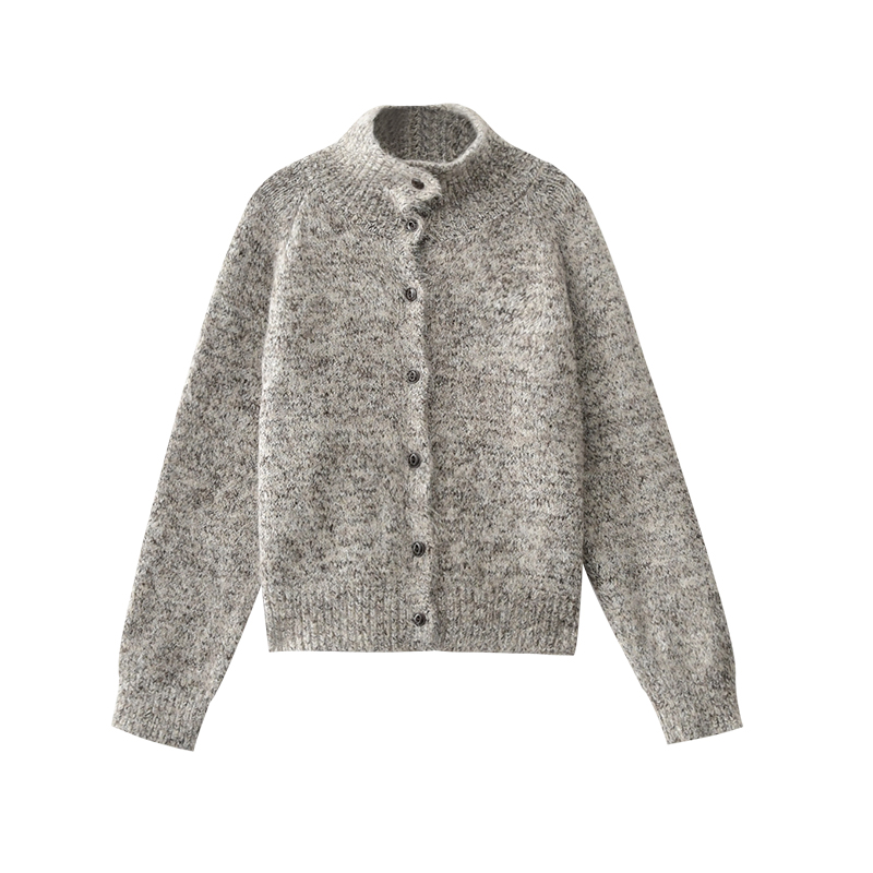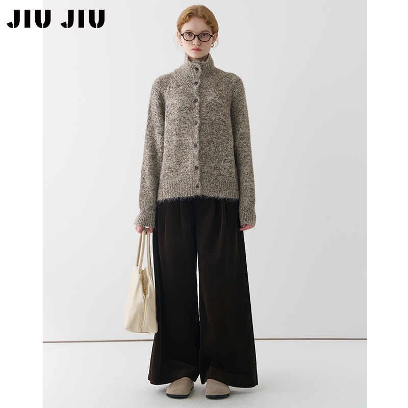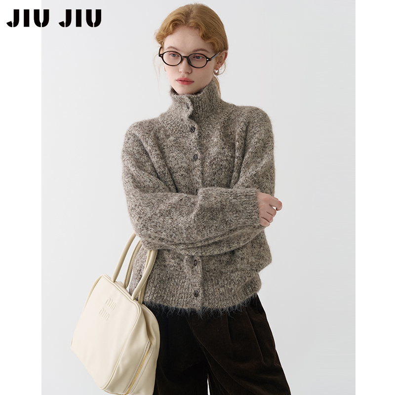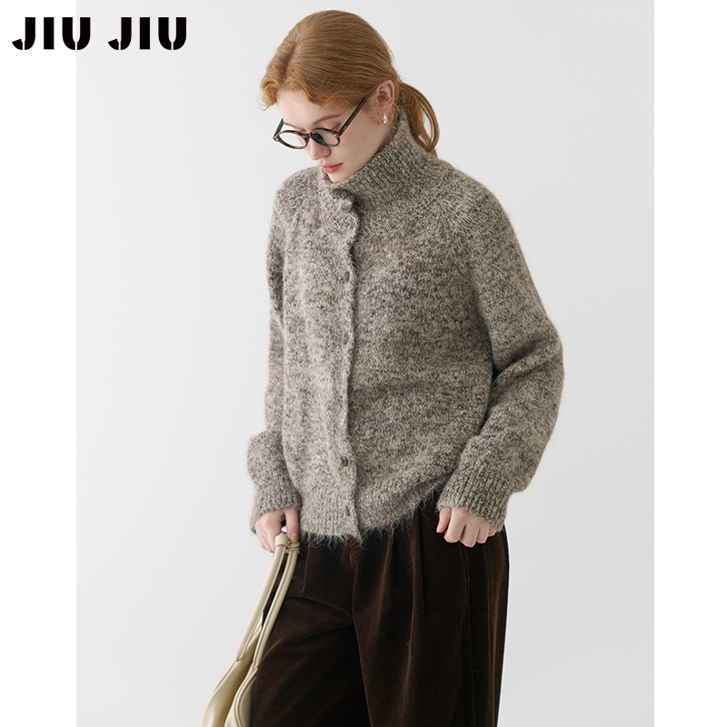 JIUJIU慵懒风复古花纱高领针织开衫女秋冬单排扣翻领加厚毛衣外套