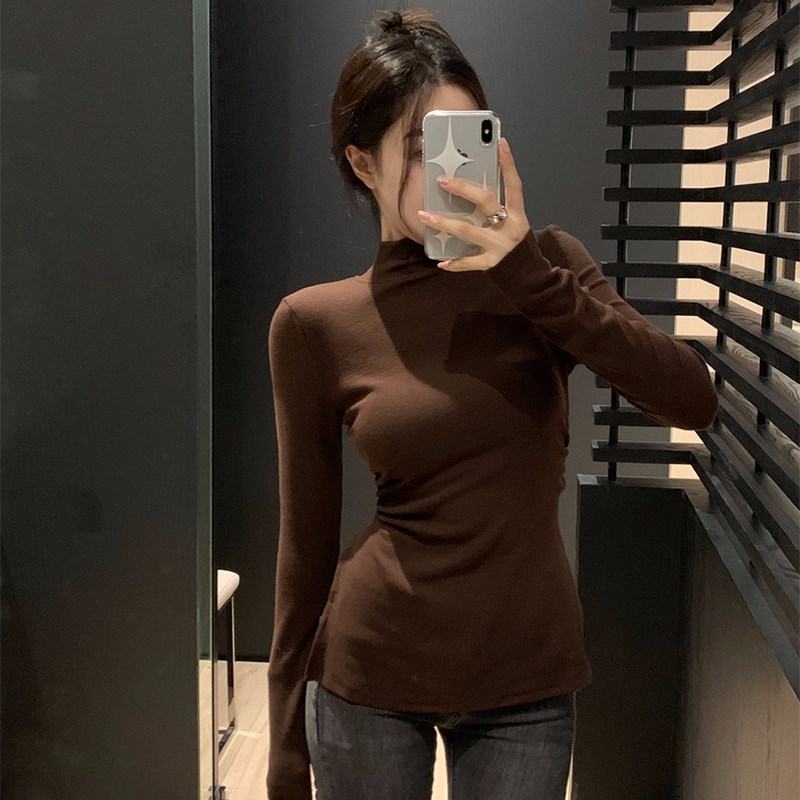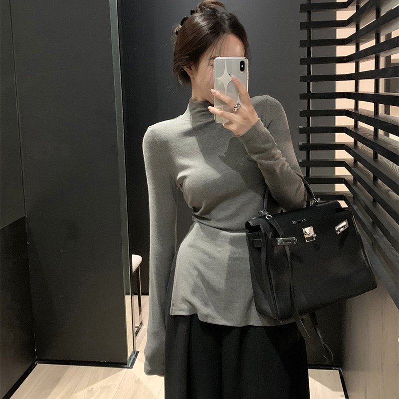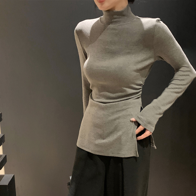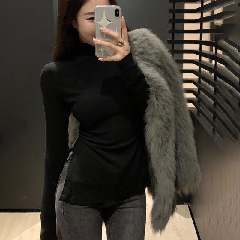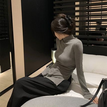中长款半高领打底衫女春秋冬内搭遮屁股上衣开叉修身收腰长袖T恤