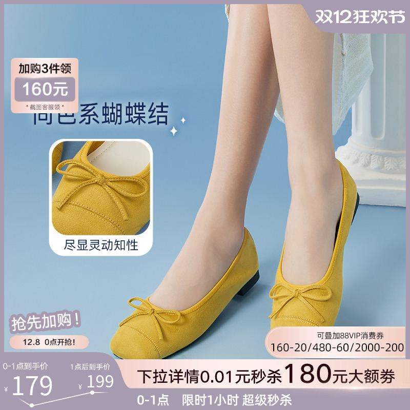 百思图25秋新款红色芭蕾单鞋绒面浅口蛋卷鞋平底女布鞋B2700CQ5