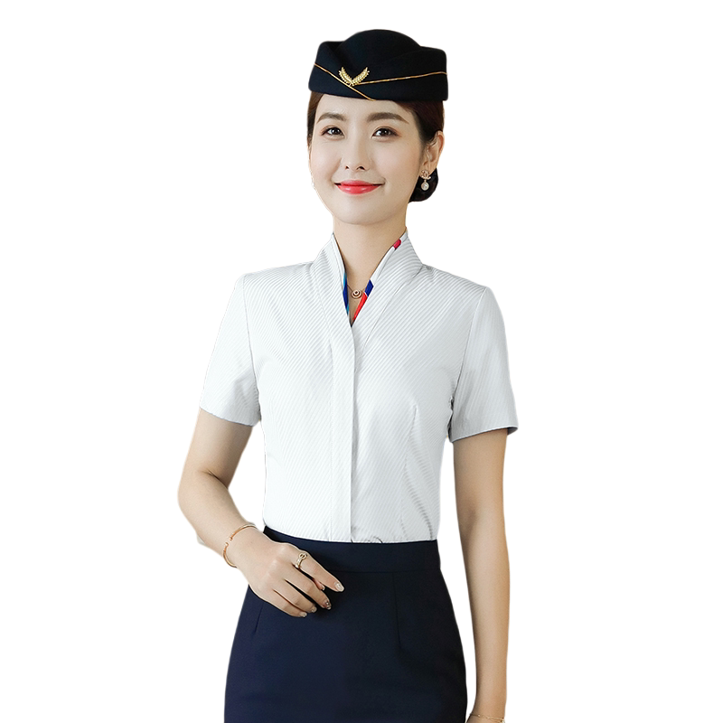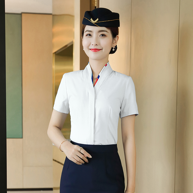 2025春夏职业空乘衬衫女士修身气质空姐面试V领短袖衬衣白色上衣