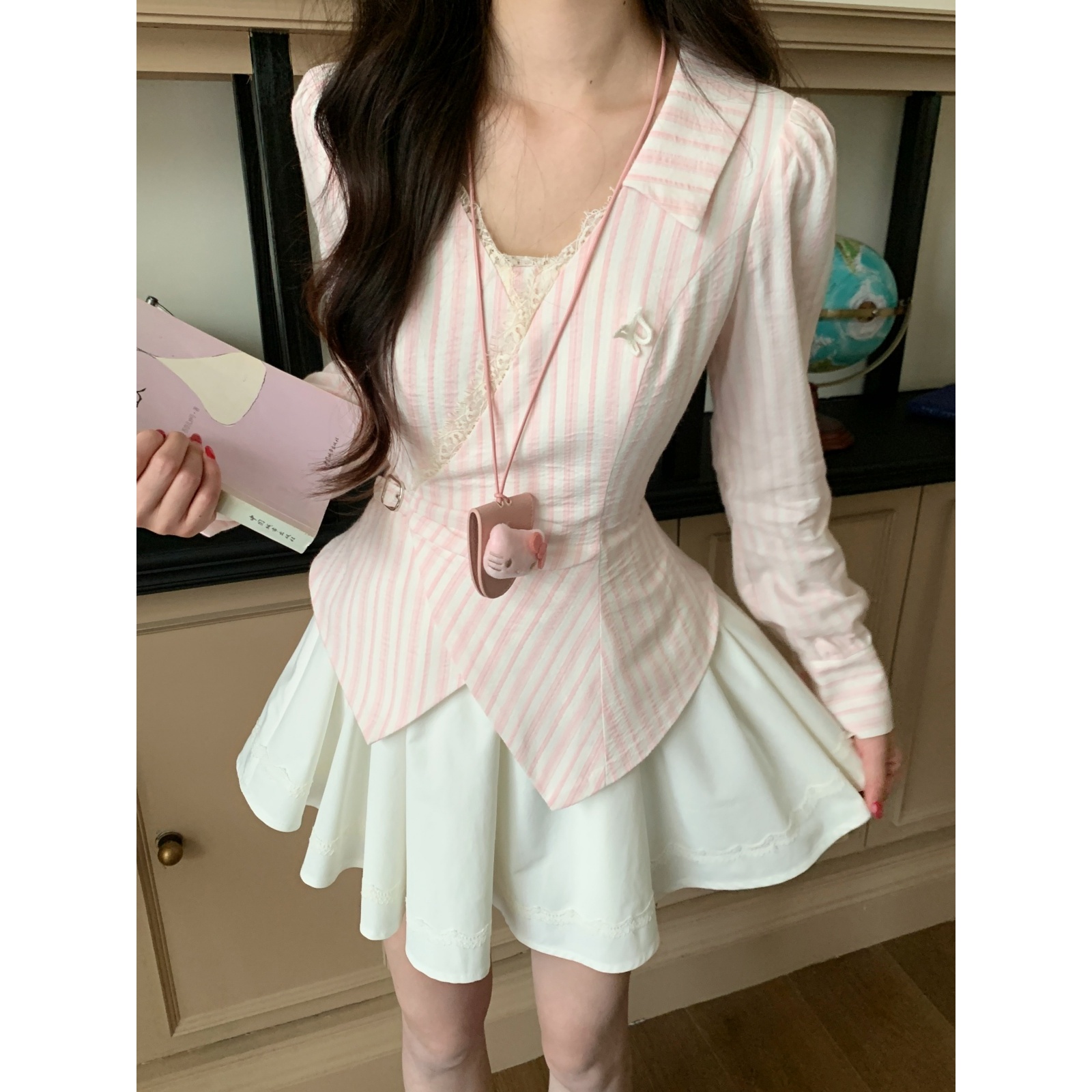 越韩小鱼 轻颜半夏 法式少女风长袖粉色条纹拼接假两件连衣裙女