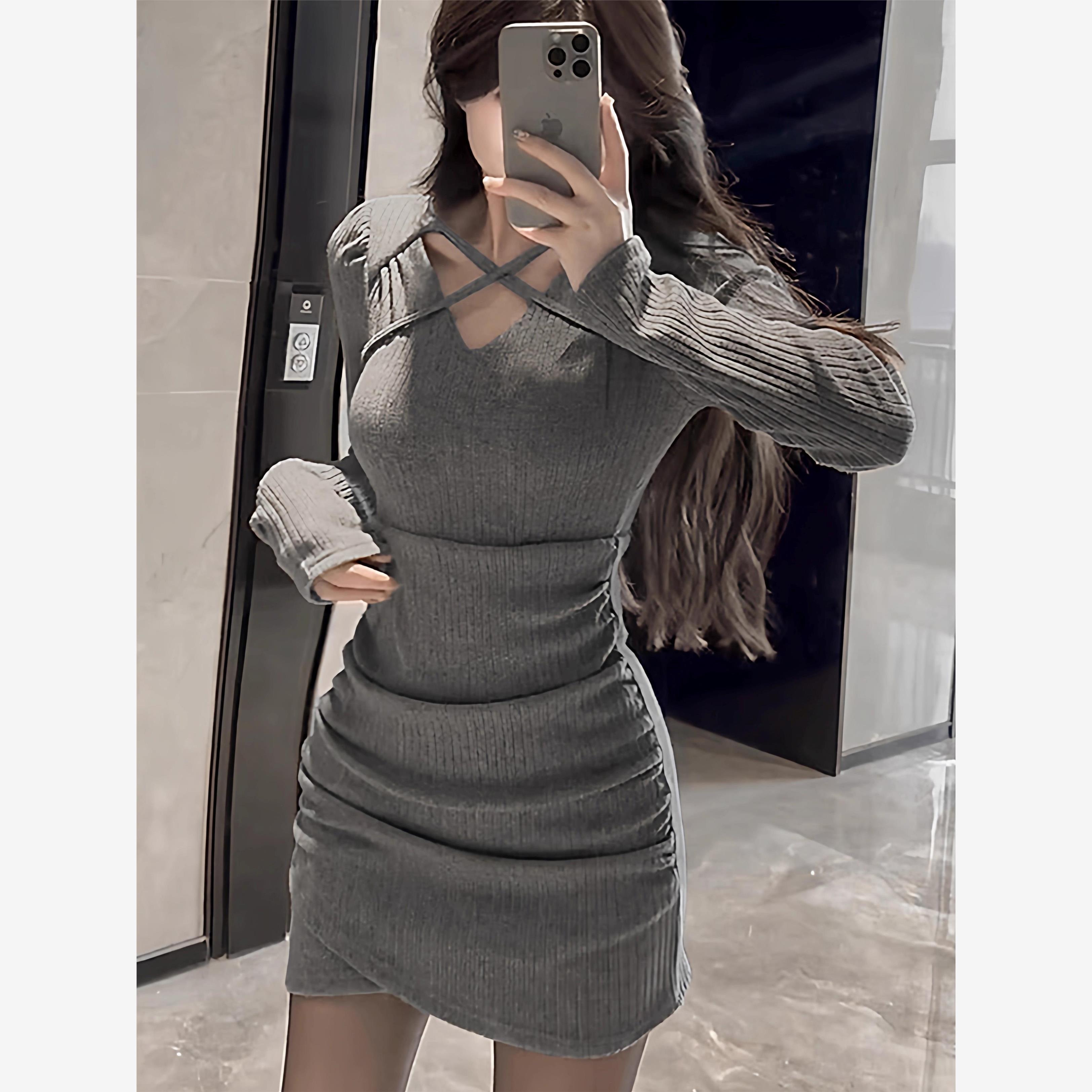 纯欲辣妹风V领长袖连衣裙女秋冬高级感大衣内搭气质打底包臀短裙