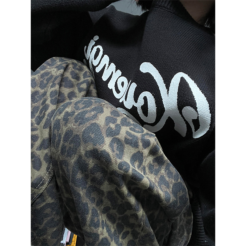 大码美式复古豹纹阔腿牛仔裤女秋冬重工宽松设计感微胖直筒拖地裤